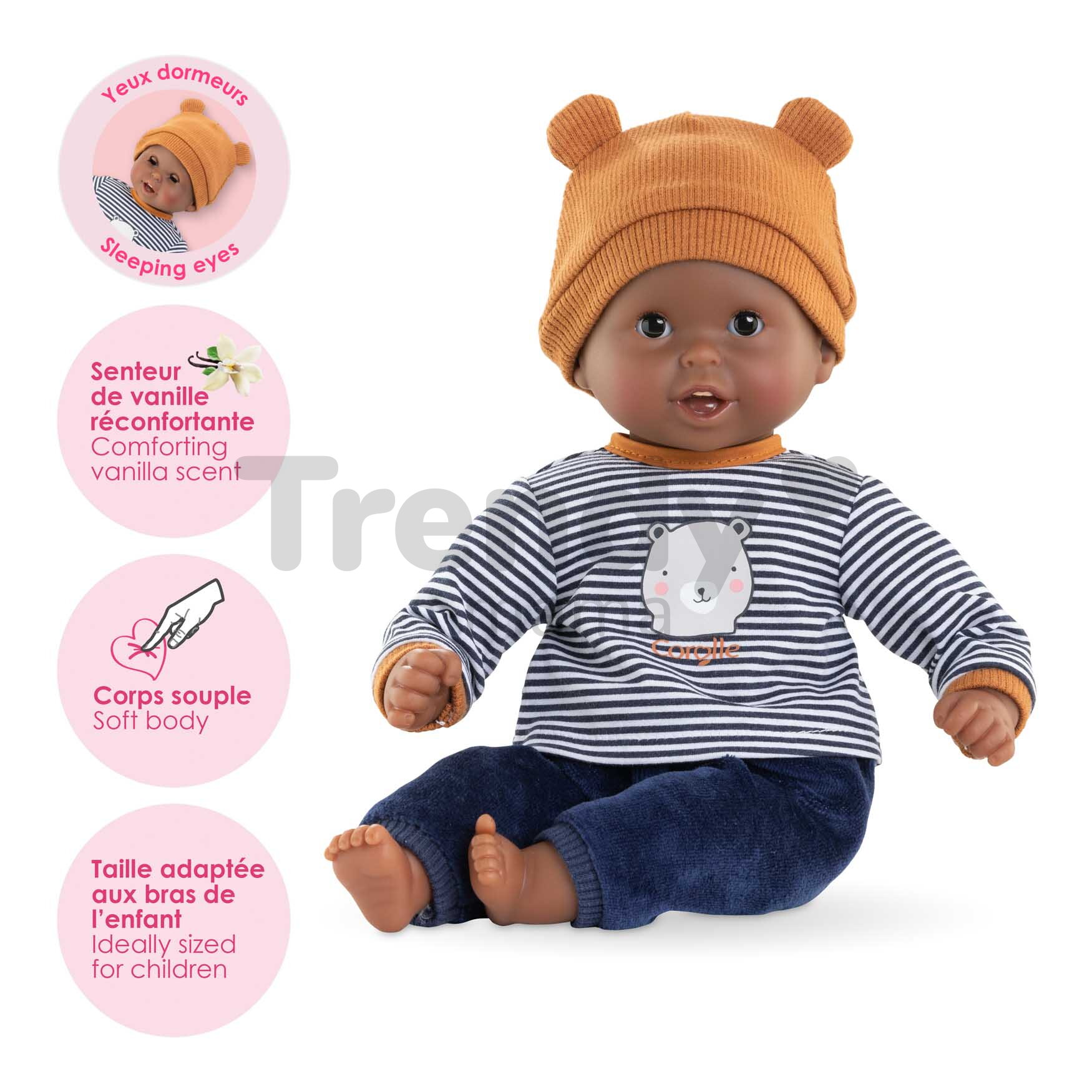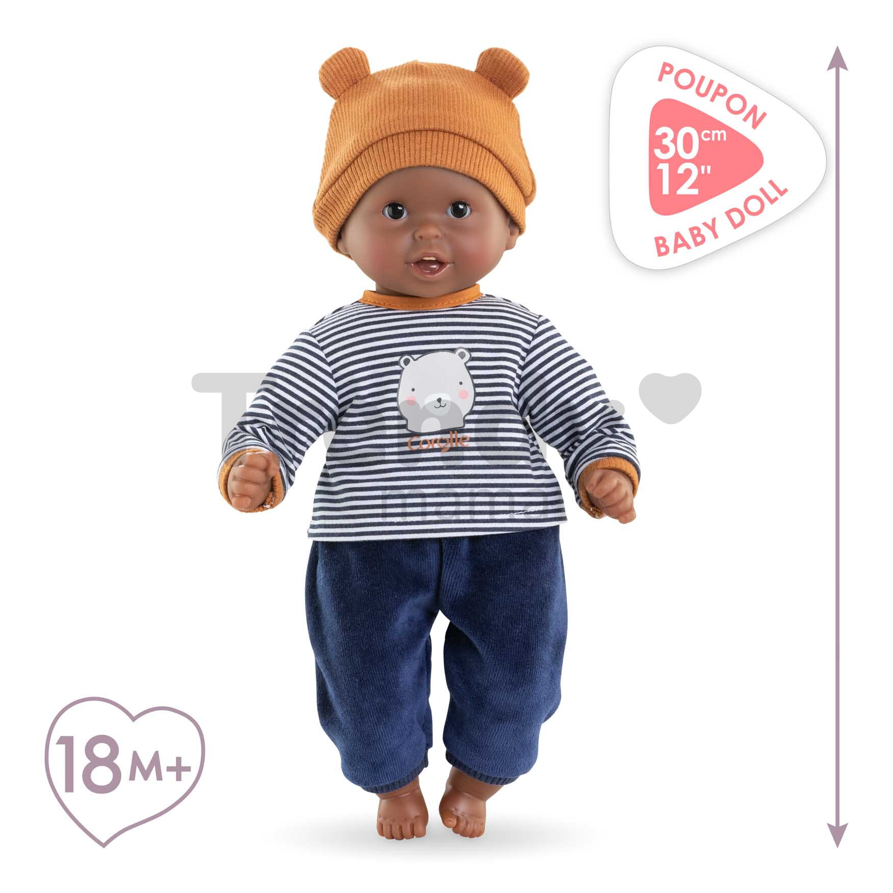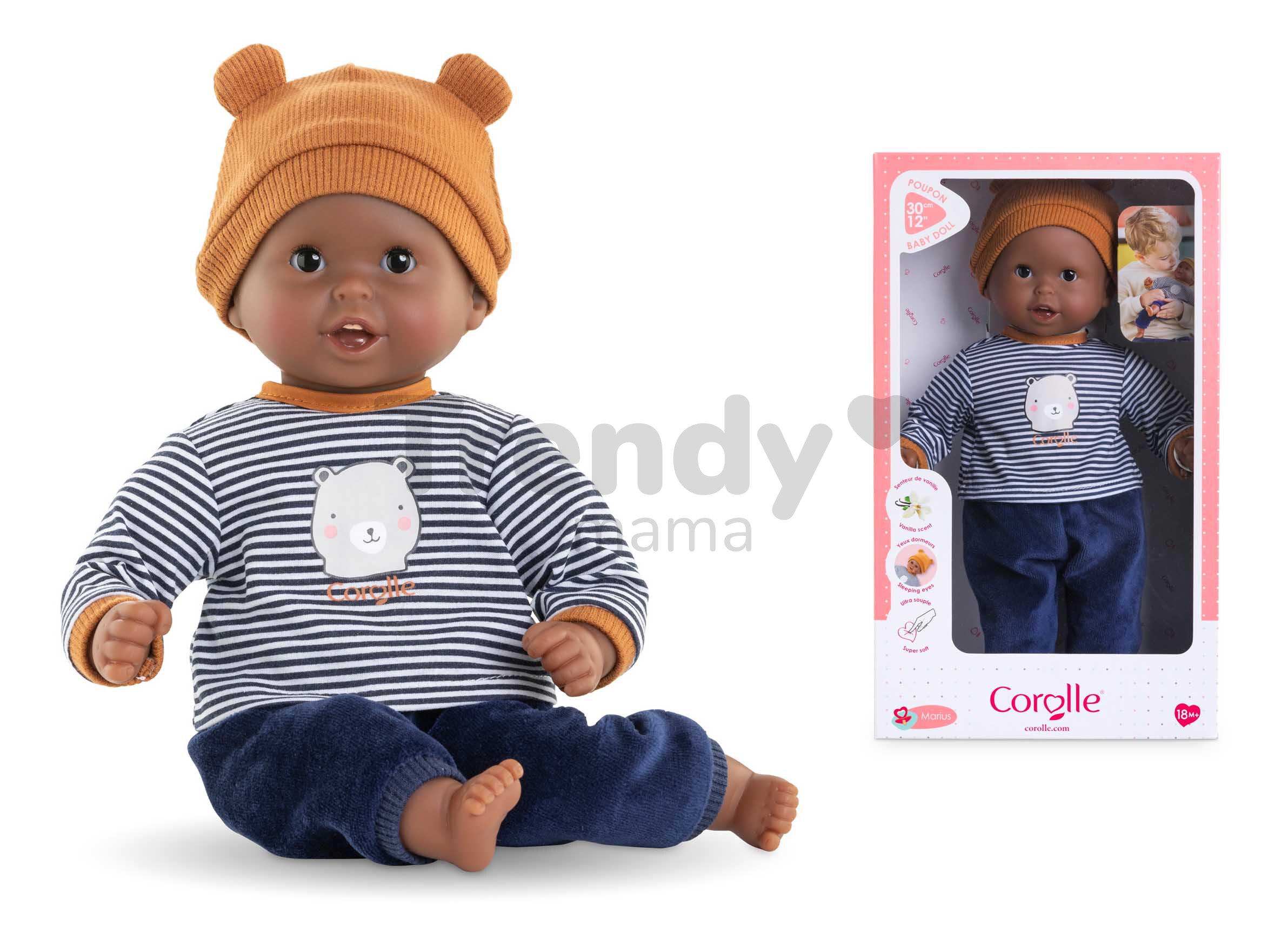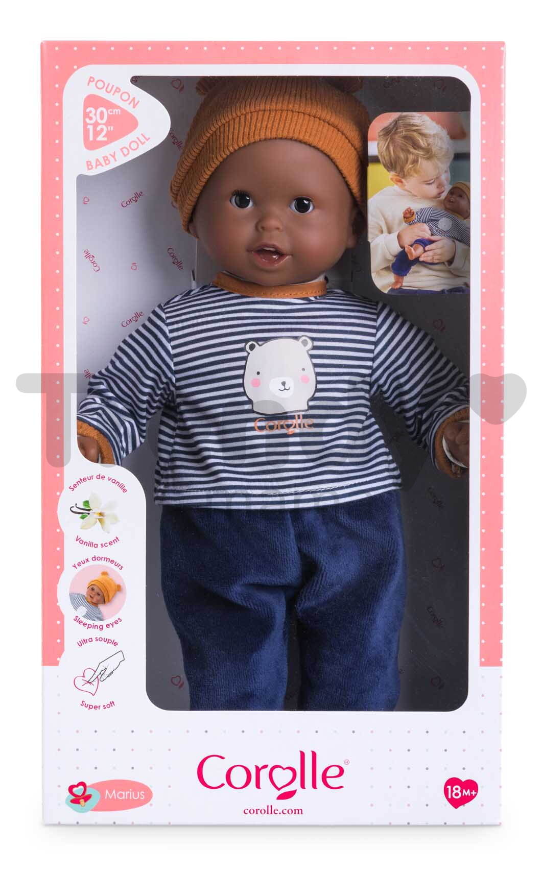 Bábika Marius má jedinečné asymetrické črty tváre, vďaka ktorým pôsobí ľudsky a sympaticky. Veselé tmavohnedé očká vyzerajú ako živé, takže hra s bábikou bude deťom pripomínať starostlivosť o skutočné bábätko. Každú hru s touto bábikou Corolle navyše umocnia prvé zúbky aj žmurkajúce oči, ktoré sa zatvoria vždy, keď dieťatko uloží bábiku do postieľky. Vaše dieťatko si vďaka prvotriednym materiálom, perfektnému prevedeniu a láskavému výrazu vytvoria s touto bábikou pevné puto, ktoré pretrvá.