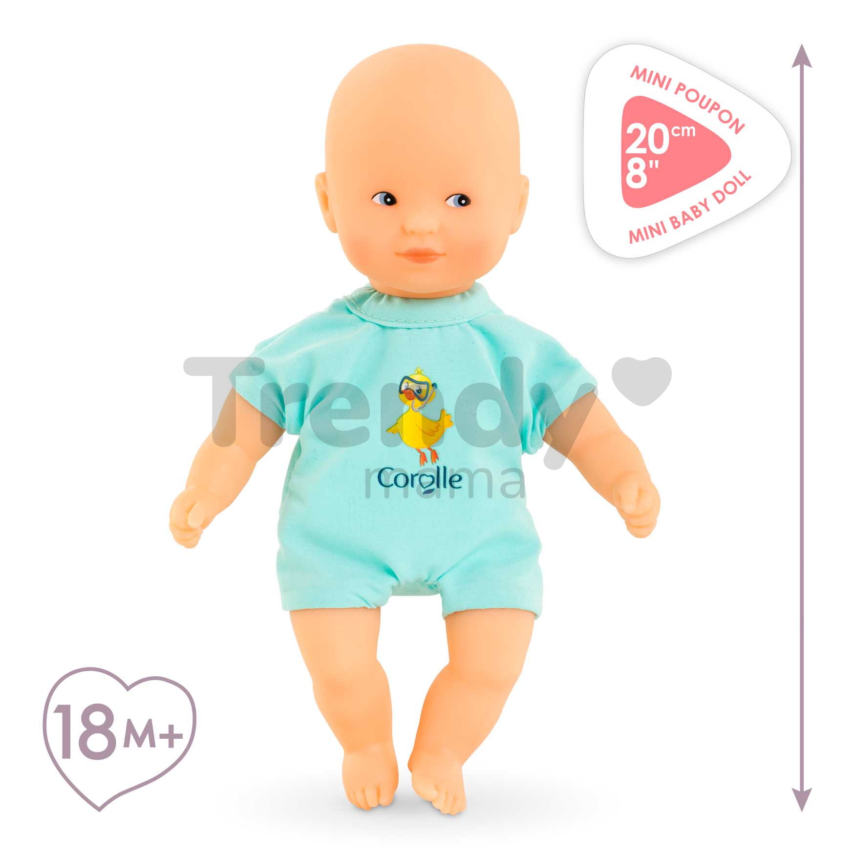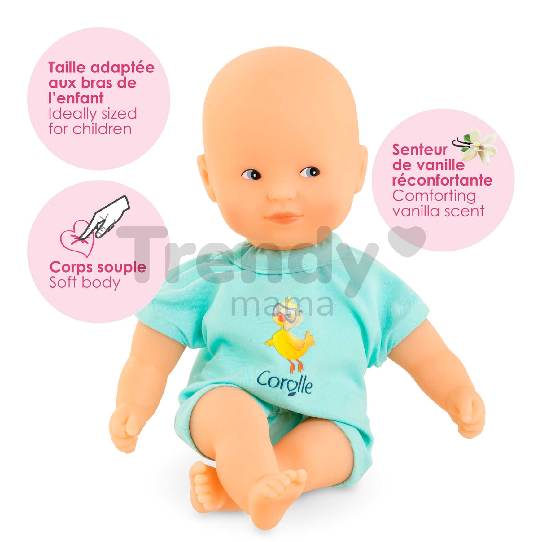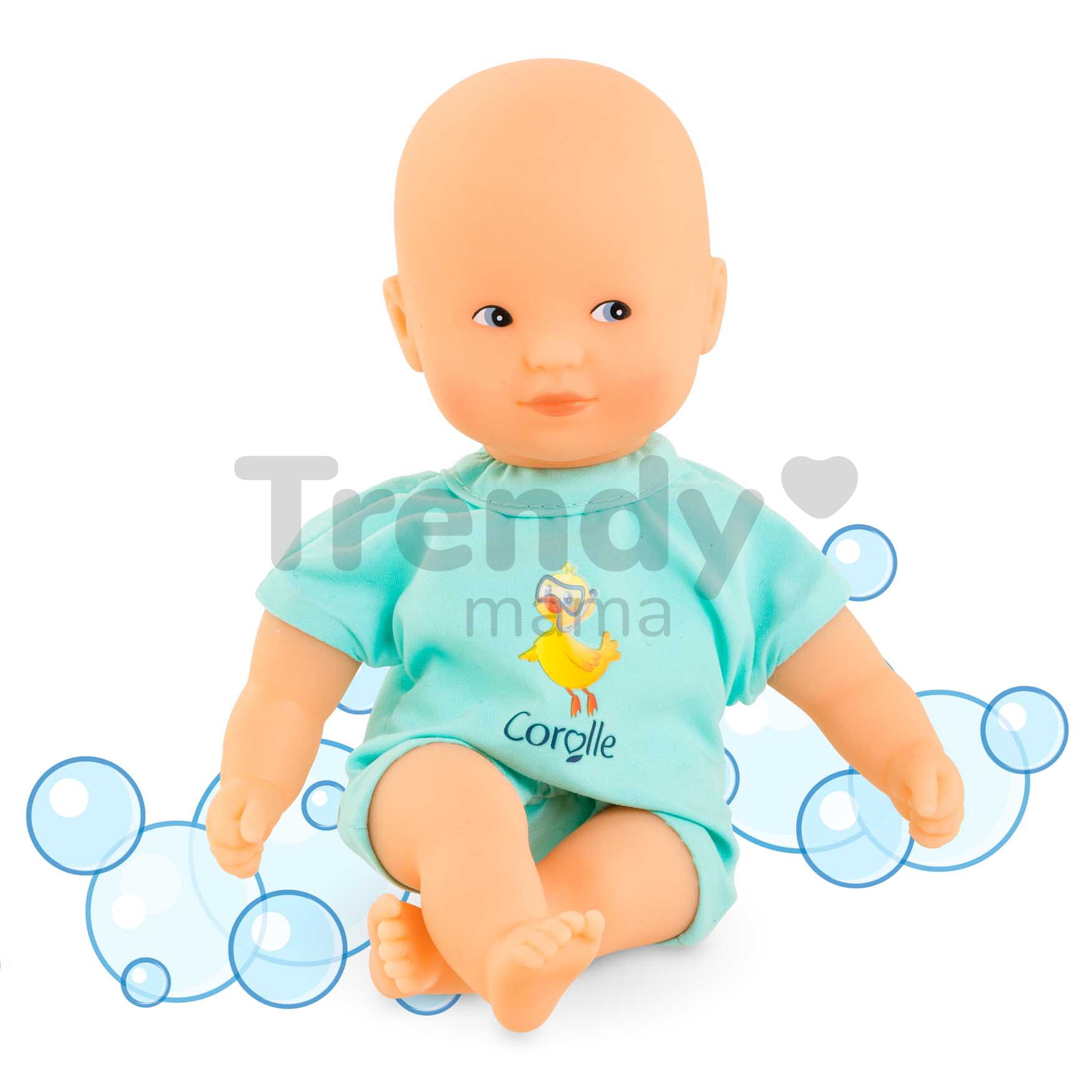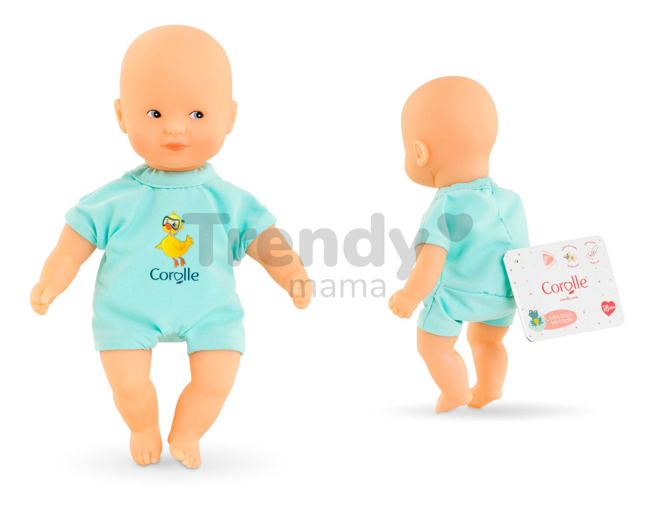 Jedinečná bábika Mini Bath Blue z dielne francúzskej značky Corolle je pripravená na veľké dobrodružstvá, ktoré s vaším dieťatkom zažije! Prekvapte svoje dieťa krásnou bábikou Corolle v tyrkysových dupačkách s nádherným francúzskym dizajnom a potlačou kačičky. Táto výnimočná bábika Mini Bath Blue pre deti od 18 mesiacov miluje vodu, takže deti si v jej spoločnosti každý kúpeľ užijú naplno.