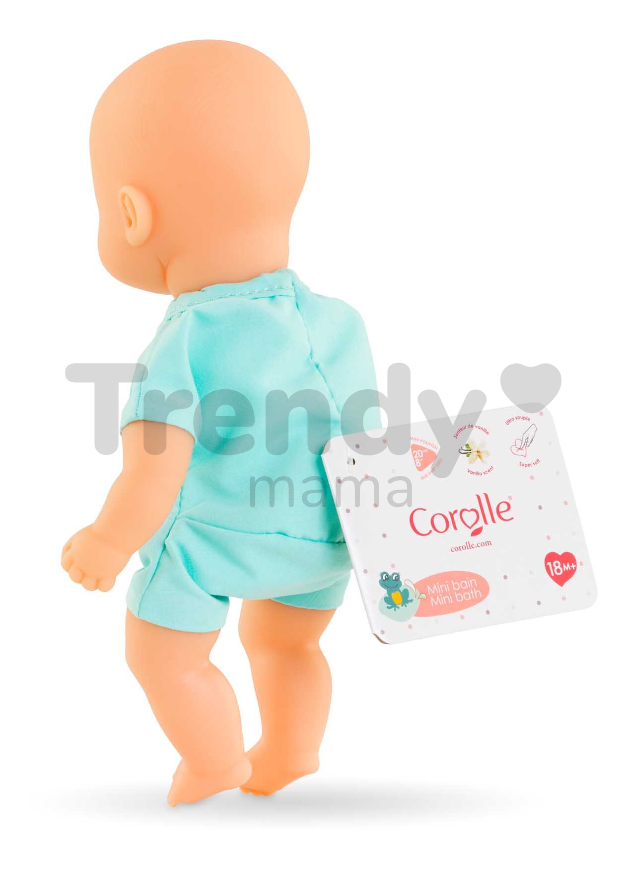 Starostlivosťou o nádhernú bábiku Corolle si deti precvičujú komunikačné schopnosti a spoznávajú vlastné emócie. Bábika Corolle v tyrkysových dupačkách je dokonale prispôsobená veku dieťatka a hra s ňou je maximálne bezpečná. Modré očká bábiky Mini Bath Blue, ktoré sú stále žiarivé a veselé, sú namaľované trvácnou farbou a nehrozí tak, že ich deti svojimi skúmajúcimi prštekmi vylúpnu. Bábiku Mini Bath perte ručne pri maximálne 40°C iba s použitím jemného tekutého mydla a sušte ju na vzduchu.