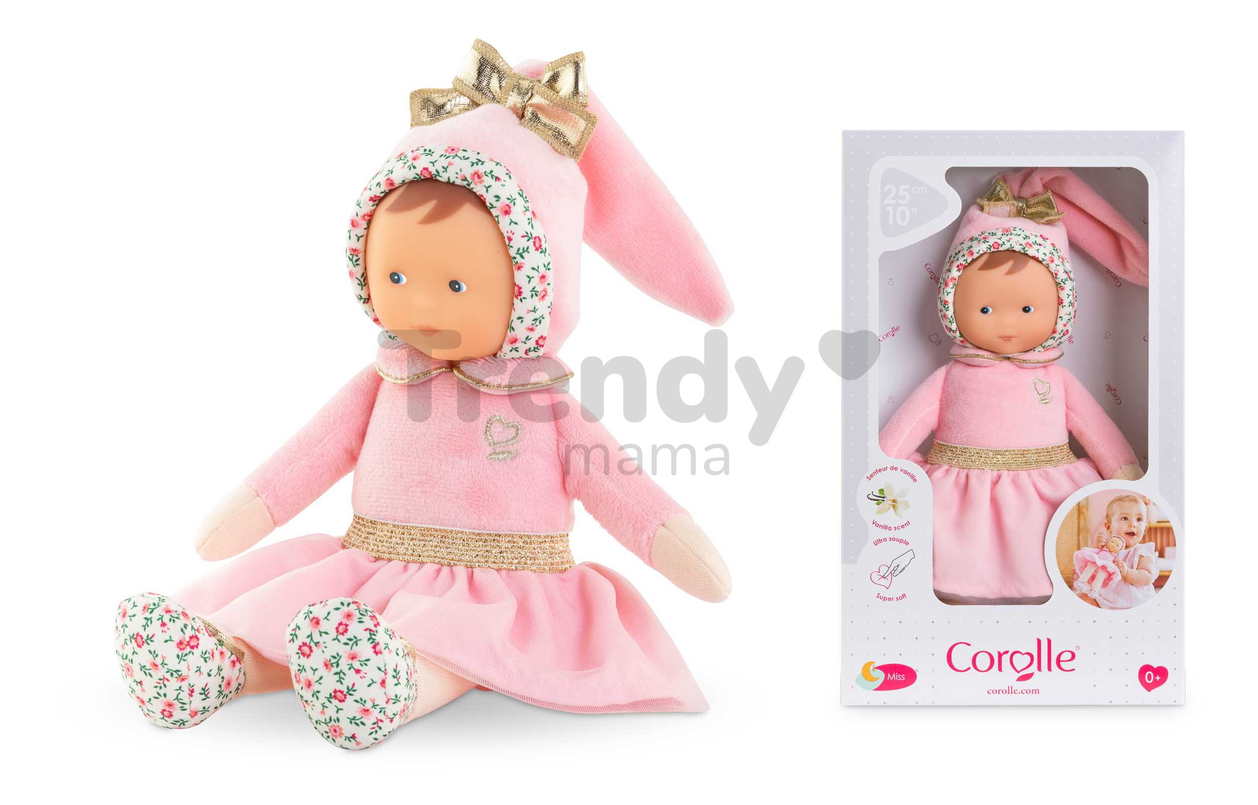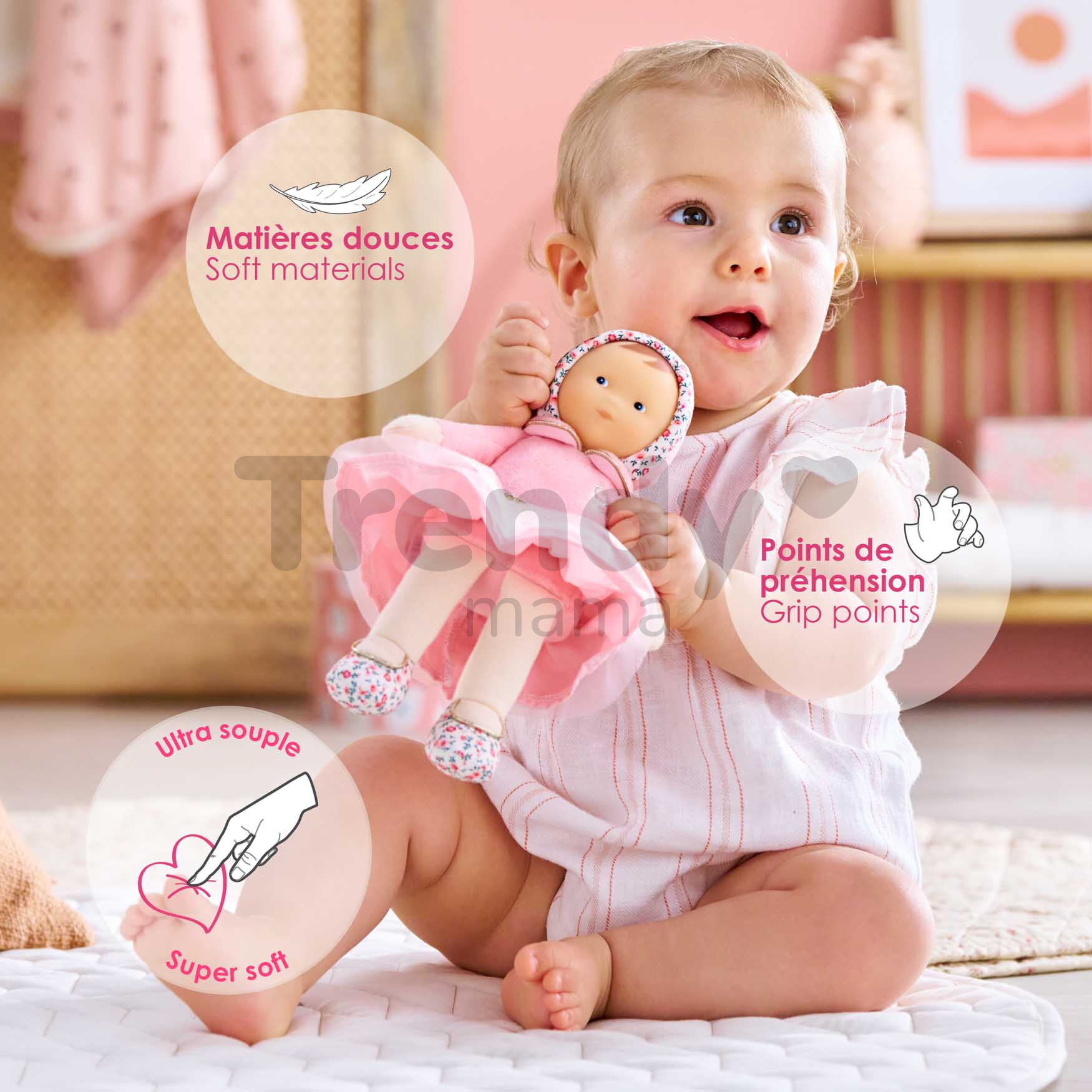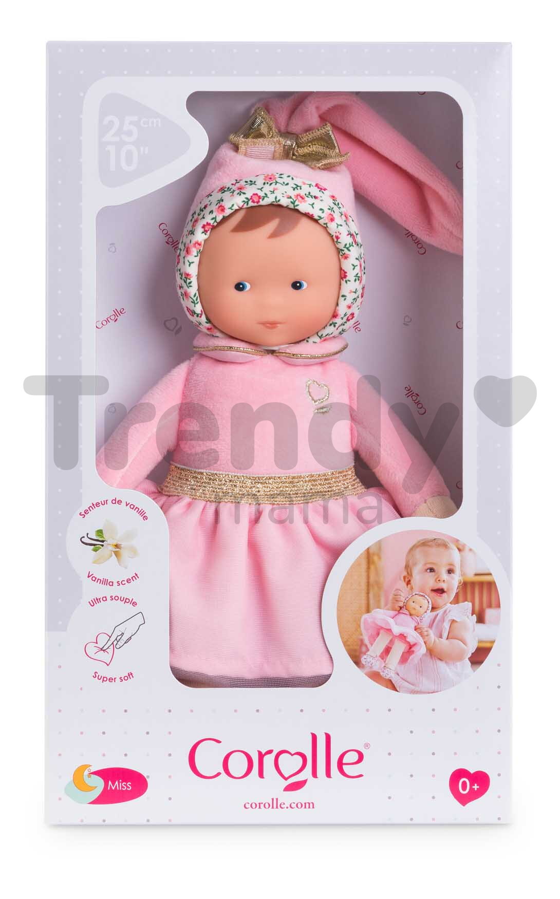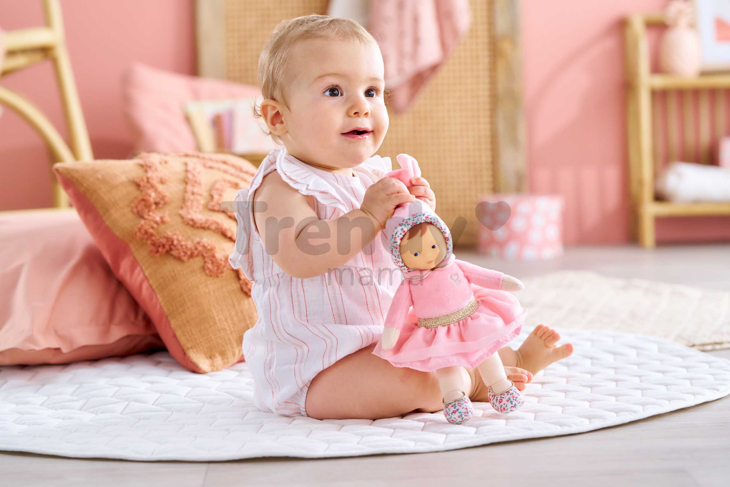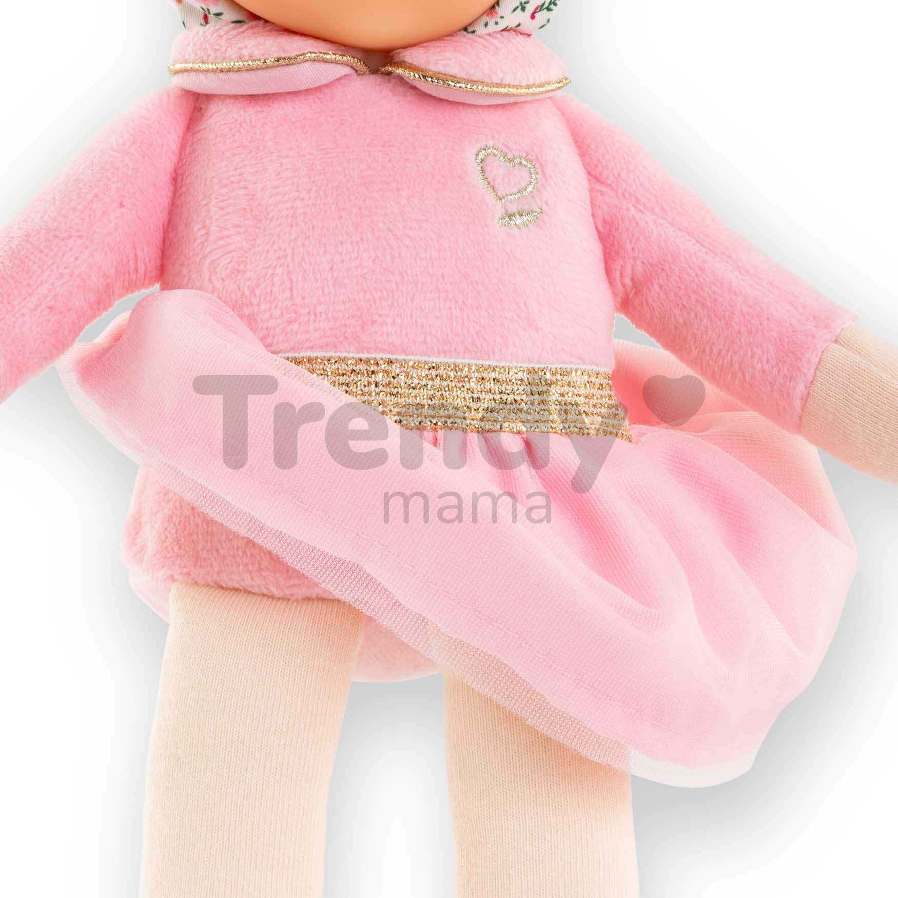 Jedinečná bábika Miss Ballerina Pink Grenadine má asymetrickú tváričku s modrými očkami, ktorá pôsobí ľudsky a od prvej chvíle si získa pozornosť vášho bábätka. Jemná vanilková vôňa a mäkké, ľahké telíčko sa zase postarajú o sladký, ničím nerušený spánok. Jemné pršteky detí už pri prvom dotyku objavia materiály príjemné na pohladenie i pritúlenie a vďaka dlhému vrkoču so zlatou mašľou, ručičkám a nožičkám si deti už od útleho veku precvičujú správny úchop a spoznávajú rôzne povrchy. Bezpečnosť je v Corolle na prvom mieste, takže bábika Mon Doudou je dokonale prispôsobená veku dieťatka. Modré očká bábiky Mon Doudou, ktoré sú stále žiarivé a veselé, sú namaľované trvácnou farbou. Nehrozí tak, že ich deti svojimi skúmajúcimi prštekmi vylúpnu a ublížia si. Materiál, z ktorého je bábika vyrobená, je veľmi príjemný na dotyk a pôsobí prirodzene, takmer ako pokožka. Bábiku Mon Doudou môžete prať v práčke na jemnom cykle pri 30°C.