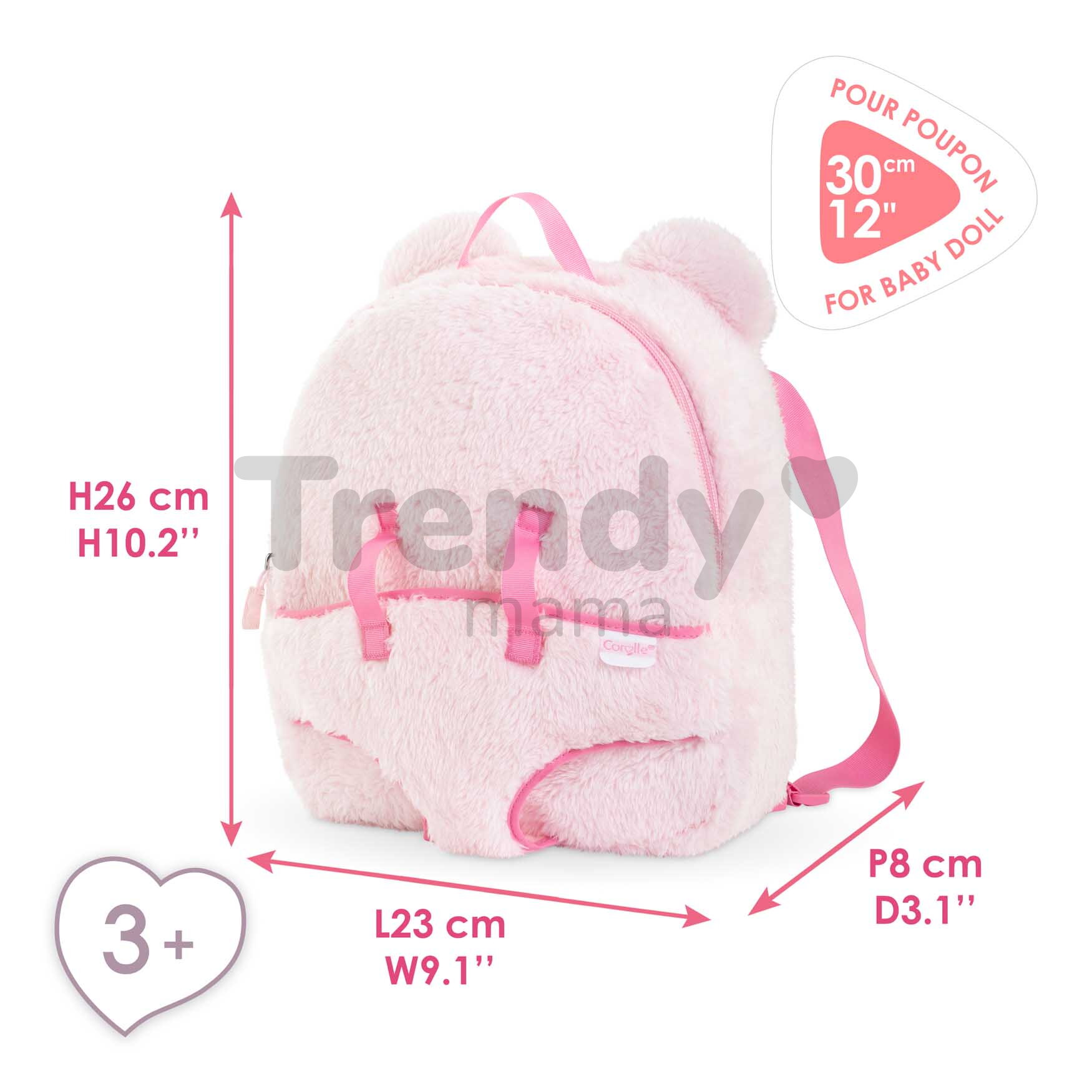 Dôkladne prepracovaný ružový batoh pre deti od 3 rokov je vyrobený z prvotriednych materiálov a poteší každú malú cestovateľku, ktorá sa odteraz môže za dobrodružstvom vydať spolu so svojou voňavou bábikou Corolle. Prekrásny detský batoh Corolle s klokankou pre bábiku sa vďaka nastaviteľným popruhom prispôsobí každému dieťaťu a jeho nosenie bude naozaj pohodlné. Výnimočný batoh z dielne značky Corolle sa svojím dizajnom perfektne hodí k bábikám Corolle a množstvu doplnkov, ktoré hru premenia na neuveriteľný zážitok. Nie je predsa nič krajšie, ako byť do detailov zladená so svojou milovanou bábikou. Batoh v prípade potreby očistite navlhčenou handričkou.