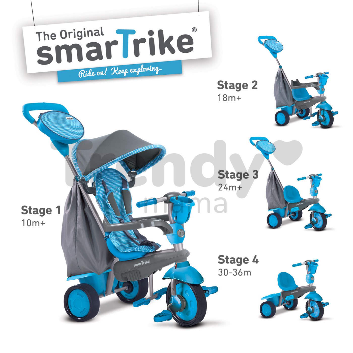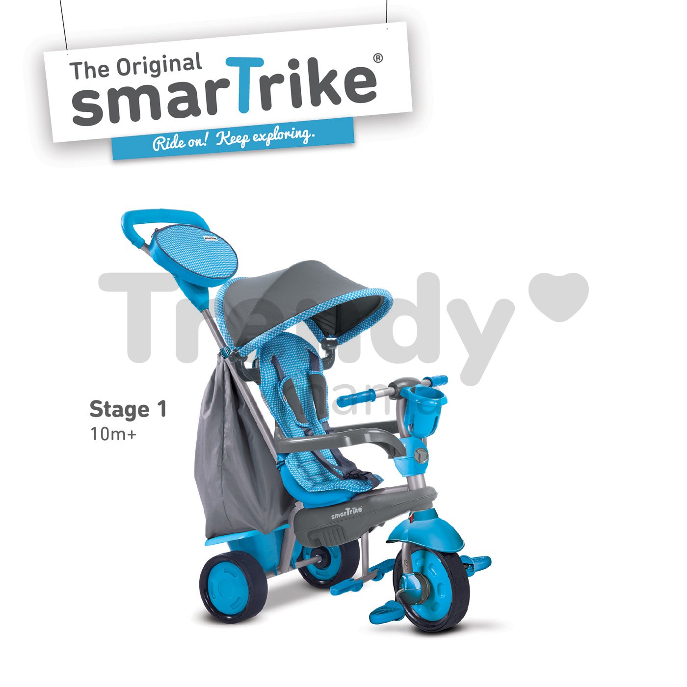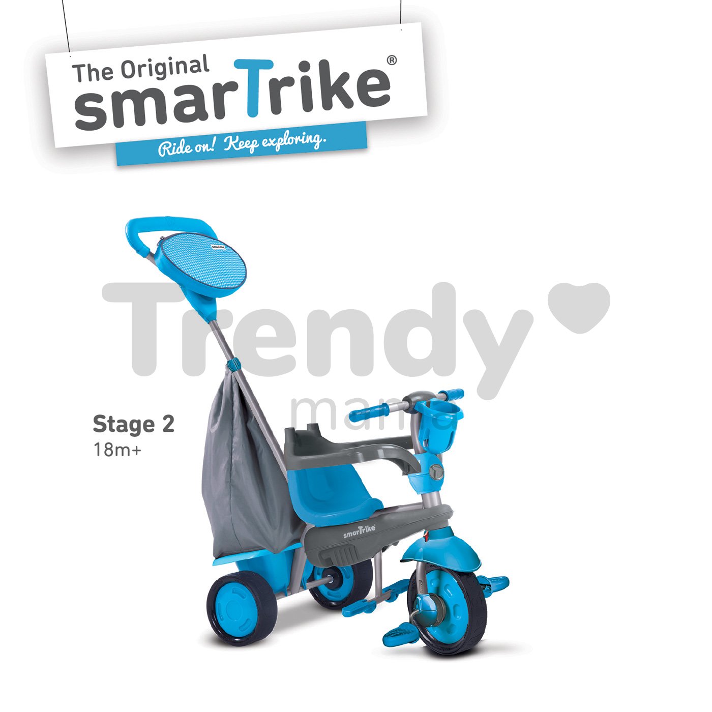 Detská trojkolka smarTrike Swing Blue 4v1 je kompromisom medzi kočíkom a tradičnou trojkolkou. Má krásny luxusný a moderný dizajn, s ktorým sa vaše dieťa bude cítiť bezpečne a užije si každú jazdu a objavovanie mesta či parku. Navyše sa trojkolka stane aj vašou ozdobou. Detská trojkolka Swing Blue Touch Steering 4v1 je nová unikátna trojkolka pre deti od 10 mesiacov, ktorá rastie s vašim dieťaťom až do 3 rokov. Vďaka novej pokročilej technológii, ktorú ocenia hlavne rodičia, je detská trojkolka smarTrike plne ovládateľná len jemným dotykom a rodič dokáže rodič manévrovať s trojkolkou už aj jemným pohybom. Zabudovaný ochranný bezpečnostný pás v tvare písmena Y s mäkkým polstrovaním na ochrannej ohrádke zabezpečujú pohodlnú a bezpečnú jazdu. Konštrukcia trojkolky pre deti je pevná a kovová v kombinácii s plastovými komponentami, čo zaručuje jej stabilitu a hlavne vysokú kvalitu. Predné koleso trojkolky s dvojitým vstrekovaním má zabudovaný tlmič, ktorý si hravo poradí i s nerovnosťami na ceste. Predné koleso je tiež s voľnobehom. Detská trojkolka je pre dieťa výnimočne pohodlná, pretože má vyvýšené, ergonomicky tvarované sedadlo, ktoré dieťaťu počas chvíľ, kedy dieťa nemanévruje a nepedáluje, poskytuje komfort na oddych a pohodlné sedenie, prípadne krátky spánok. Milým doplnkom trojkolky je plastový košík na fľašu umiestnený na nastaviteľných riadidlách.