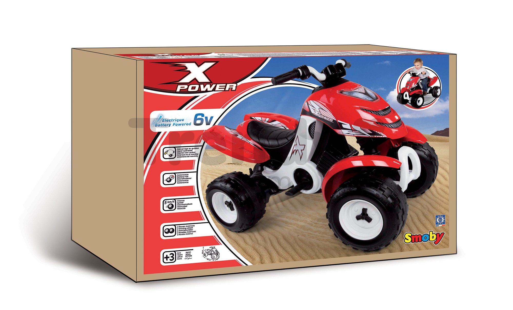 Smoby detská elektronická štvorkolka X Power funguje na batérie. Vzhľadom pripomína realistickú športovú štvorkolku s nápismi a nálepkami. Je vhodná pre deti od 3 rokov. Dieťa ovláda smer jazdy pomocou riadidiel. Naštartuje ju tlačidlom, ktoré sa nachádza na pravej strane. Štvorkolka má robustný a príťažlivý vzhľad, a každé dieťa miluje jazdu na nej. Rozmery detskej štvorkolky Smoby sú 96 cm dĺžka, 50 cm šírka a 63 cm výška. Po naštartovaní detskej štvorkolky sa pomaly začína posúvať a dokáže vyvinúť rýchlosť 5 km/h. Je to primeraná rýchlosť, ktorú dokážu zvládnuť už deti od 3 rokov. Batéria má 6V a pri plynulom chode vydrží 2 hodiny. V prípade potreby sa dajú dokúpiť ďalšie náhradné batérie a tak sa jazda môže jednoducho predĺžiť.