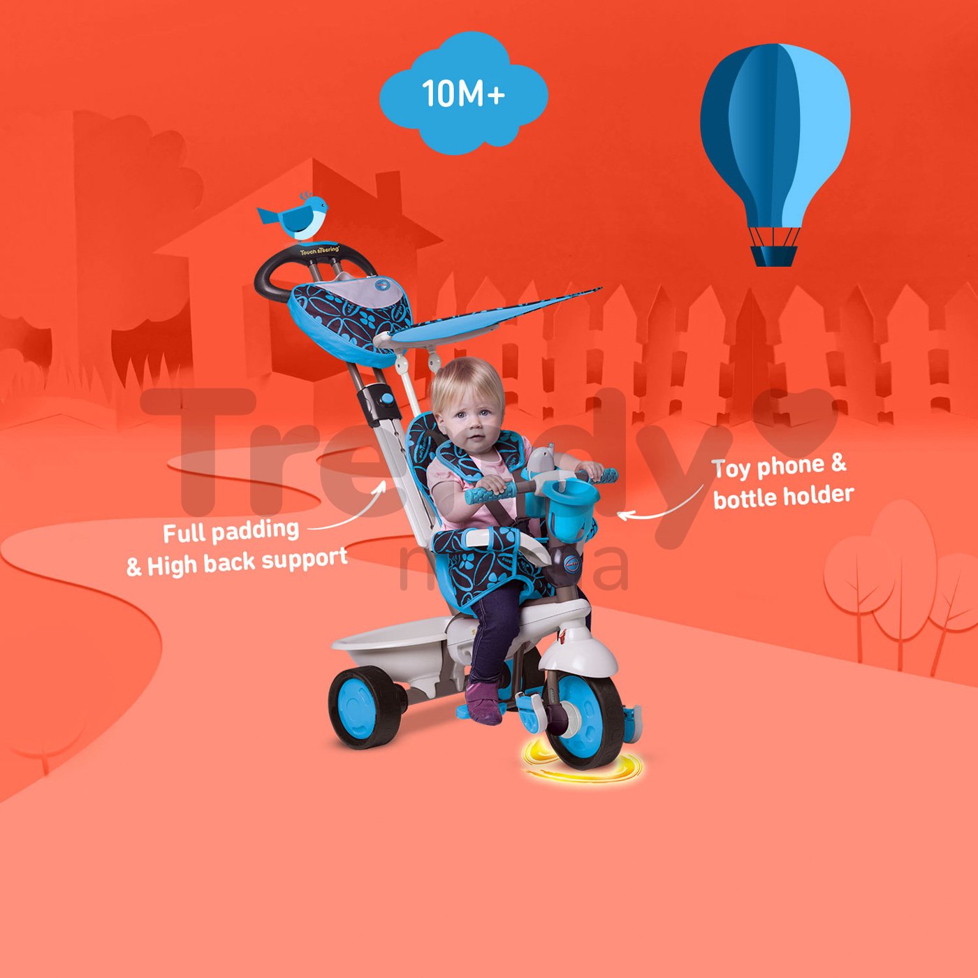 Dieťa má ruky počas jazdy ovládanej rodičom položené na opierke na zabezpečenie najvyššej pohodlnosti. Jednotlivé časti ako i ochranný pás sú polstrované, čo trojkolke zaručuje pohodlnosť. Jednotlivé polstrované časti sa dajú odňať a v prípade potreby vyprať. Detská trojkolka Touch Steering má patentovanú unikátnu technológiu, a je odporúčaná pre deti od 10 až do 36 mesiacov. Technológia Touch Steering umožňuje extra ľahké manévrovanie. Krásna detská trojkolka smarTrike Dream Team Blue Touch Steering má modro-šedé farebné prevedenie s aplikáciou geometrických tvarov a kvetiniek, ktorá je vhodná najmä pre chlapčeka. Vyberte si detskú trojkolku smarTrike, výrobcu, ktorý je jednotkou na trhu v produkcii a inováciách.