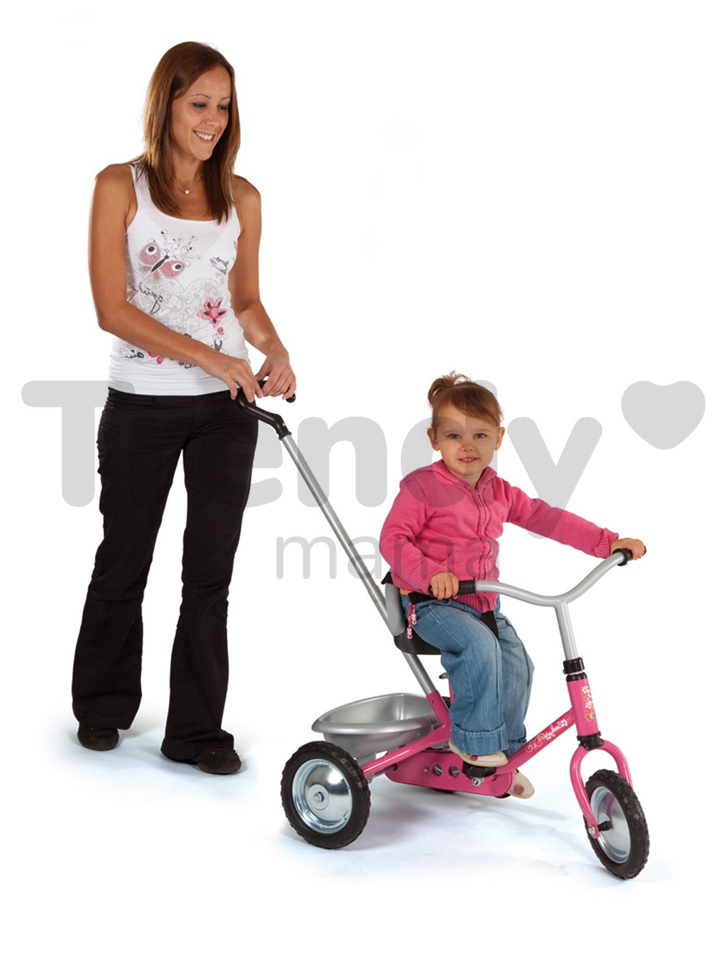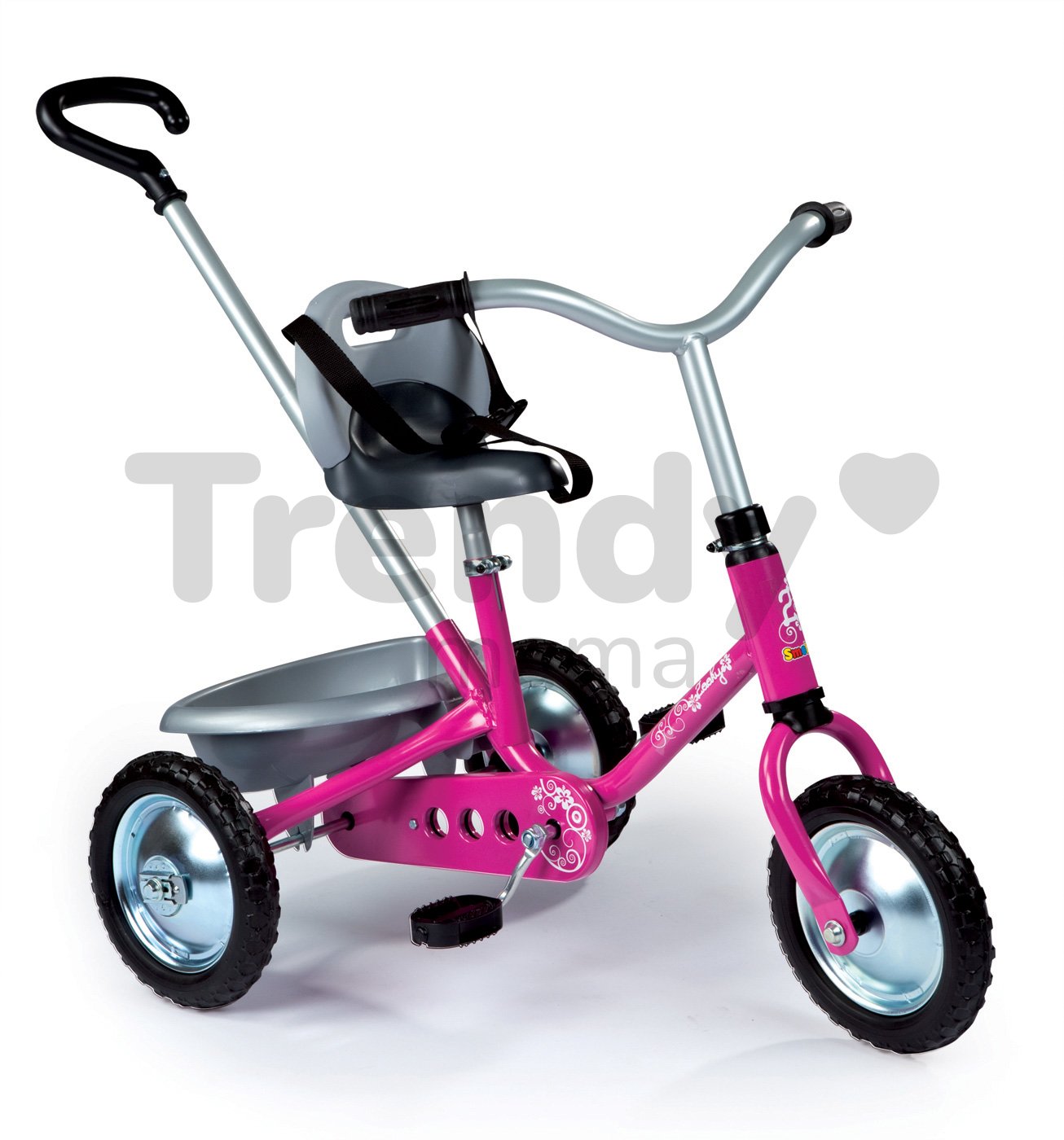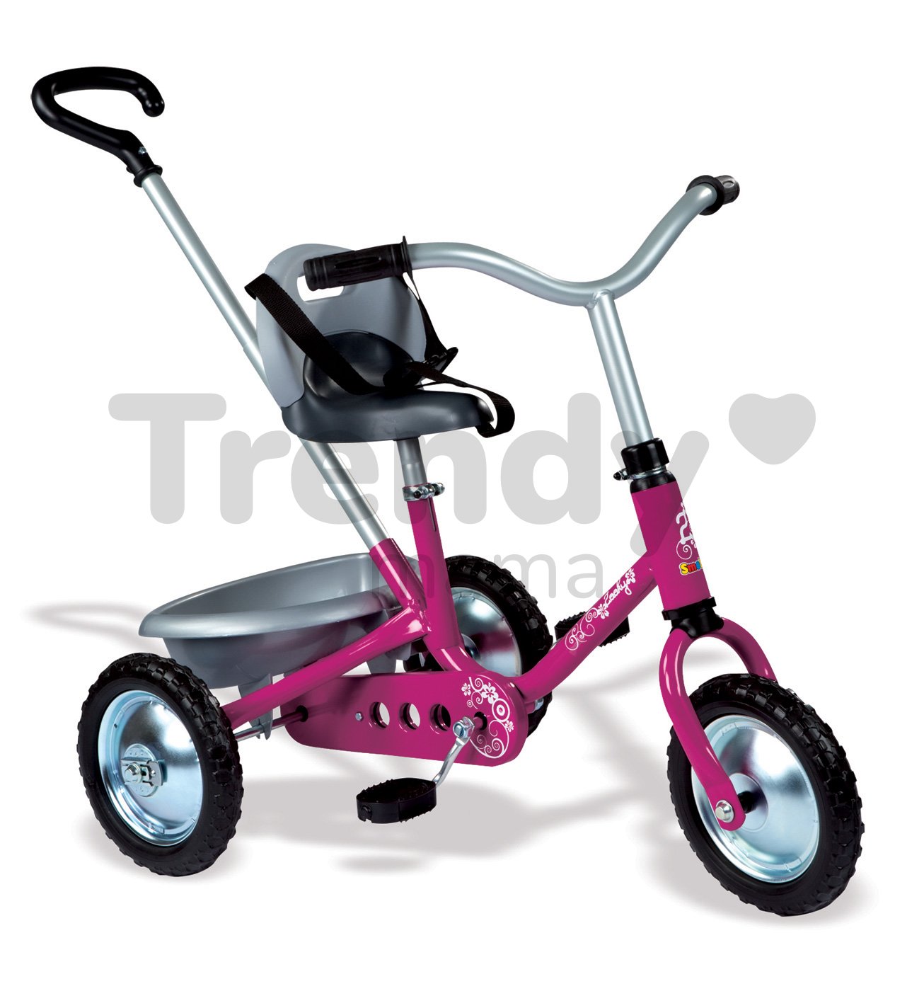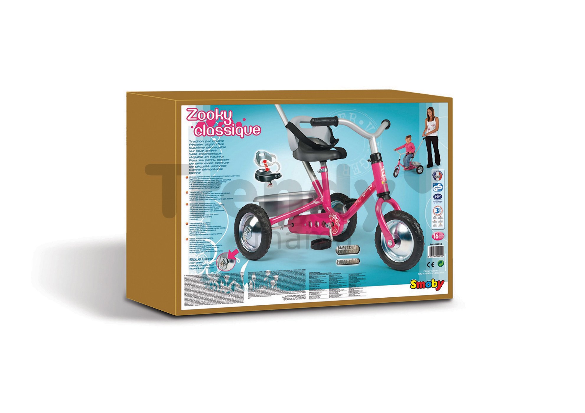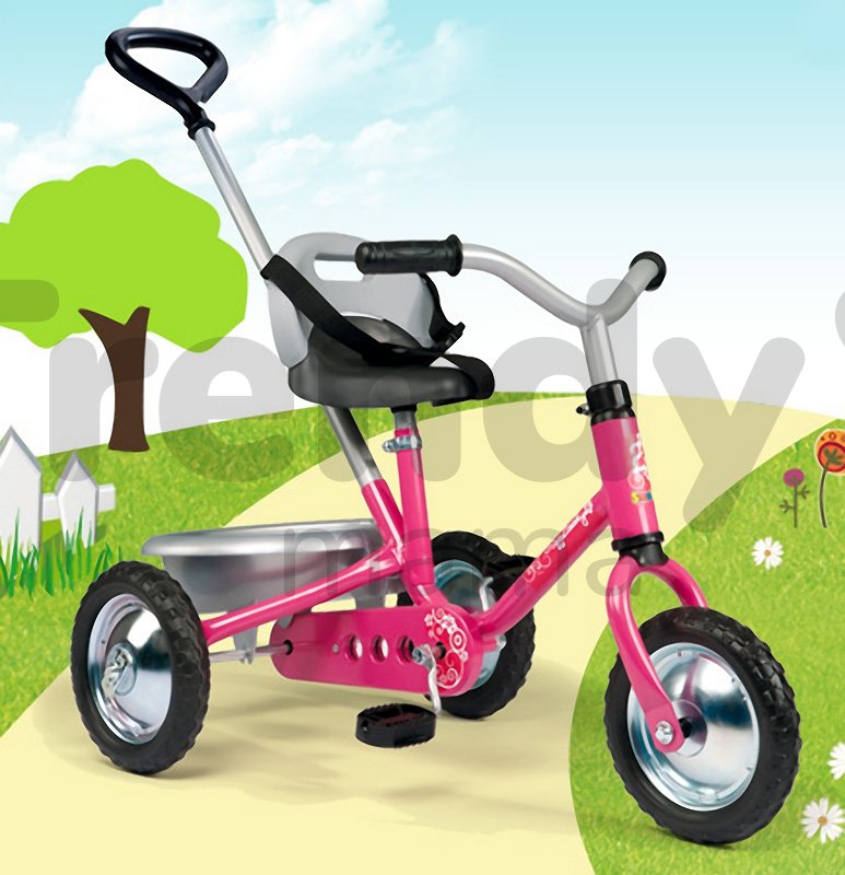 Trojkolka pre deti od francúzskeho výrobcu hračiek Smoby, tradičná reťazová Zooky Classice je ružovo-striebornej farby. Pohon trojkolky pre deti je tradičný, na reťaz. Predné koleso je s voľnobehom. Je to klasická trojkolka, s pevnou kovovou konštrukciou s ktorou sa dieťa hrá dlhé roky. Už od 16 mesiacov, kým je dieťa malé a nie je schopné jazdiť samostatne, ho tlačíme pomocou vodiacej tyče. Dieťa rastie a spolu s ním i jeho trojkolka. Smoby Zooky Clasic deti používajú až do 36 mesiacov a ďalej. Ružová trojkolka je vhodná hlavne pre malé dievčatká, ktoré majú radi pohyb vonku. V počiatočných štádiách jazdy dieťaťu pomáhame tlačením prostredníctvom rodičovskej rúčky, a zároveň udržujeme smer jazdy a rýchlosť. Dieťa sa pohodlne opiera o vysokú opierku a je pripútané bezpečnostným pásom. Riadidlá trojkolky sa nedajú uzamknúť, ale rodič ovláda smer jazdy. Riadidlá trojkolky ako aj sedadlo je výškovo nastaviteľné.