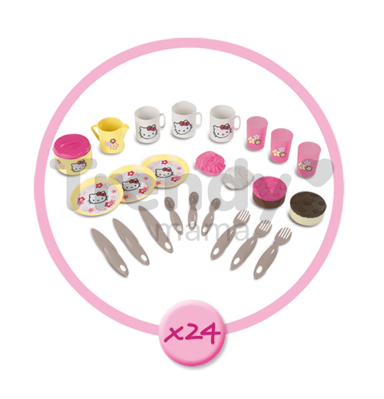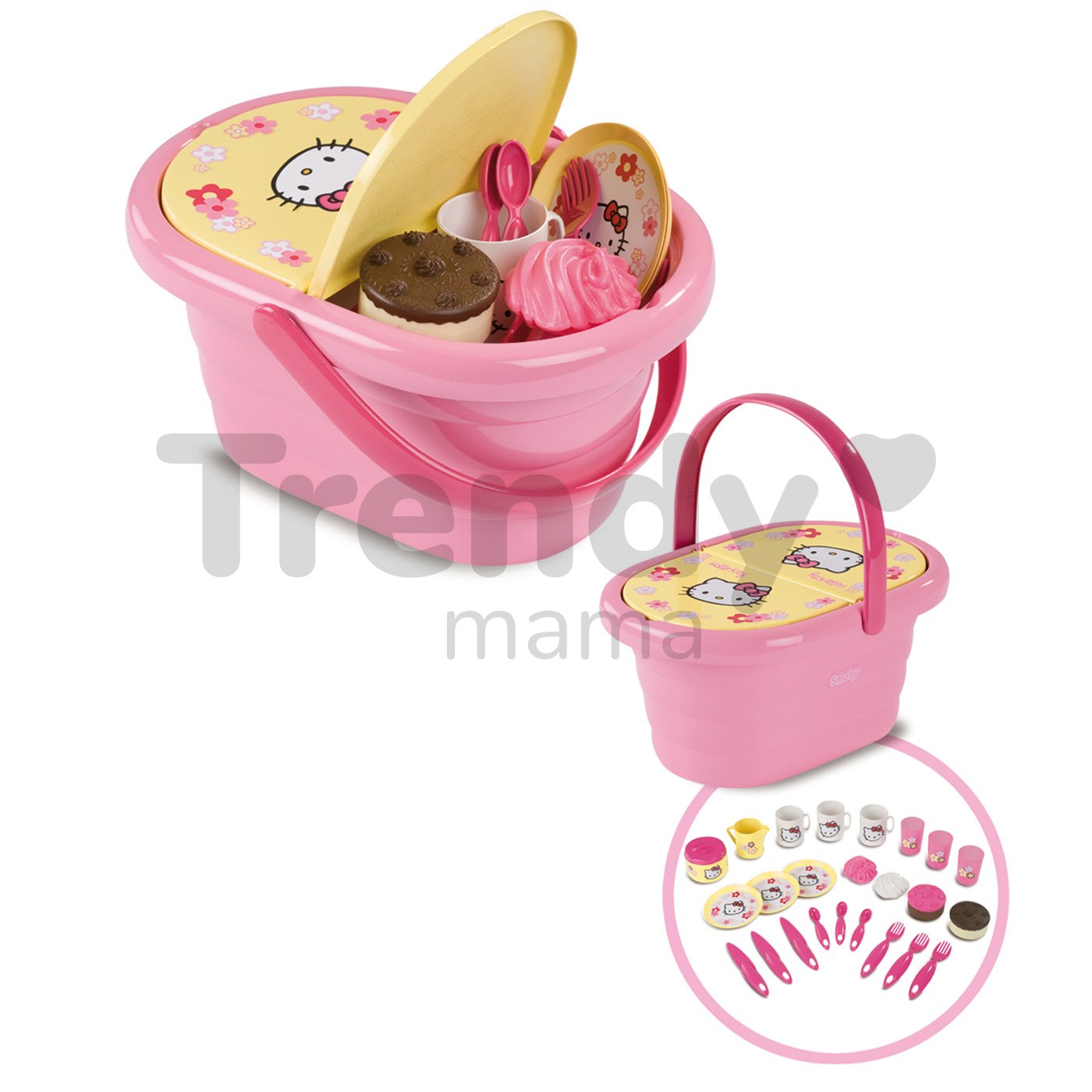 Súčasťou výbavy detského piknikového košíka sú 3 žlté tanieriky s bielym obrázkom Hello Kitty, 3 vidličky, 3 nožíky a 3 malé lyžičky ružovej farby. Dôležitou súčasťou detskej piknikovej sady sú aj 3 biele šálky s uškom, 3 ružové poháriky bez uška, 1 žltý pohárik s uškom a 1 nádobka. Okrem základného riadiku na piknik sa v piknikovom košíku pre deti Hello Kitty nachádzajú aj 4 krásne a chutné koláčiky. Všetky doplnky sú krásne farebne zladené s celým piknikovým setom pre deti. Detskú piknikovú sadu možno použiť aj na nákupy, prechádzky v prírode alebo prípadne na odkladanie iných hračiek. Vďaka svojmu modernému dizajnu bude krásnym doplnkom na každom popoludňajšom pikniku, ktorý si vaša malá princezná môže užiť so svojimi kamarátkami.