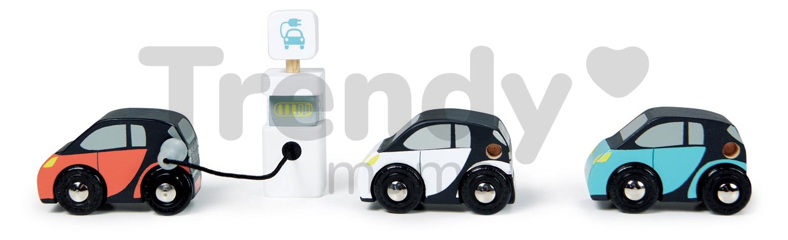 Drevené elektromobily Smart Car Set predstavuje vynikajúcu sadu autíčok pre všetky deti a najmä chlapcov od 18 mesiacov. Originálna 4-dielna drevená sada v pravom britskom štýle obsahuje 3 Smart autíčka a nabíjaciu stanicu. Každé z autíčok má na boku nabíjací port, do ktorého dieťa zapojí nabíjací kábel zo stanice. Moderné elektromobily s nabíjacou stanicou navrhli špičkoví dizajnéri Tender Leaf Toys priamo vo Veľkej Británii a na výrobe sa podieľali zruční remeselníci. Autíčka ani nabíjacia stanica nedisponujú elektronickými funkciami.
