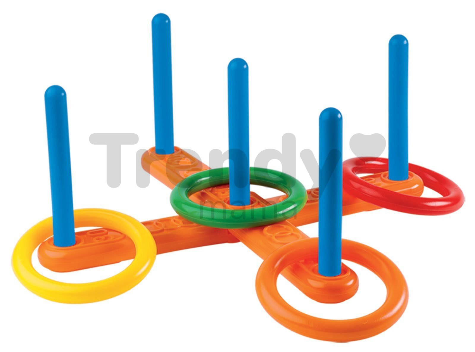 Kruhy na hádzanie pre deti od francúzskeho výrobcu Écoiffier. Stojan má päť stĺpikov (terčov), krásnu modro-oranžovú farbu, je vyrobený z kvalitného plastu a veľmi ľahko sa rozkladá a skladá. Jeho rozmery sú 41*14,5*13 cm. Detské kruhy na hádzanie sú rôznych pekných farieb, sú dobre vyvážené a dobre sa s nimi hádže. Táto zábavná súprava detských kruhov na hádzanie je vhodná ako aj do bytu, tak aj von. Detičkám precvičuje ich presnosť a odhad vzdialeností.
