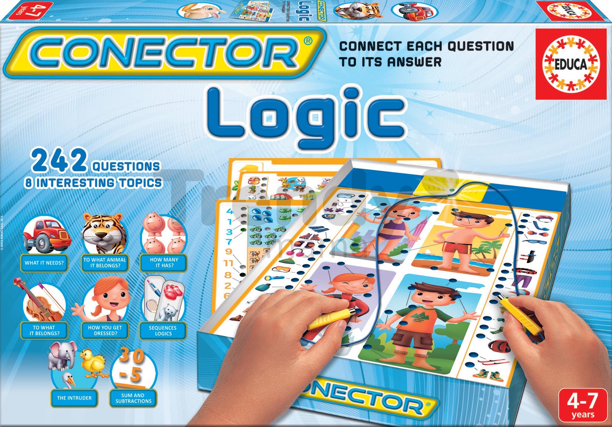 Spoločenská hra Conector Logické myslenie je úžasná detská spoločenská hra, ktorá je vhodná od 4 do 7 rokov. Hlavnú časť tejto hračky tvoria hracie dosky s obrázkami ľudí, zvieratiek, dopravných prostriedkov a mnohých ďalších predmetov. Súčasťou tejto hry je 242 otázok, prostredníctvom ktorých sa deti môžu veľa naučiť. Podstatou hry Conector je rozvoj logického myslenia detí cez jednoduché spájanie obrázkov. Deti spájajú jednotlivé otázky s odpoveďami na hracej doske. Spoločenská hra Conector je zdrojom výbornej zábavy a hravého učenia sa pre deti, preto ju zaobstarajte aj pre vaše malé ratolesti.