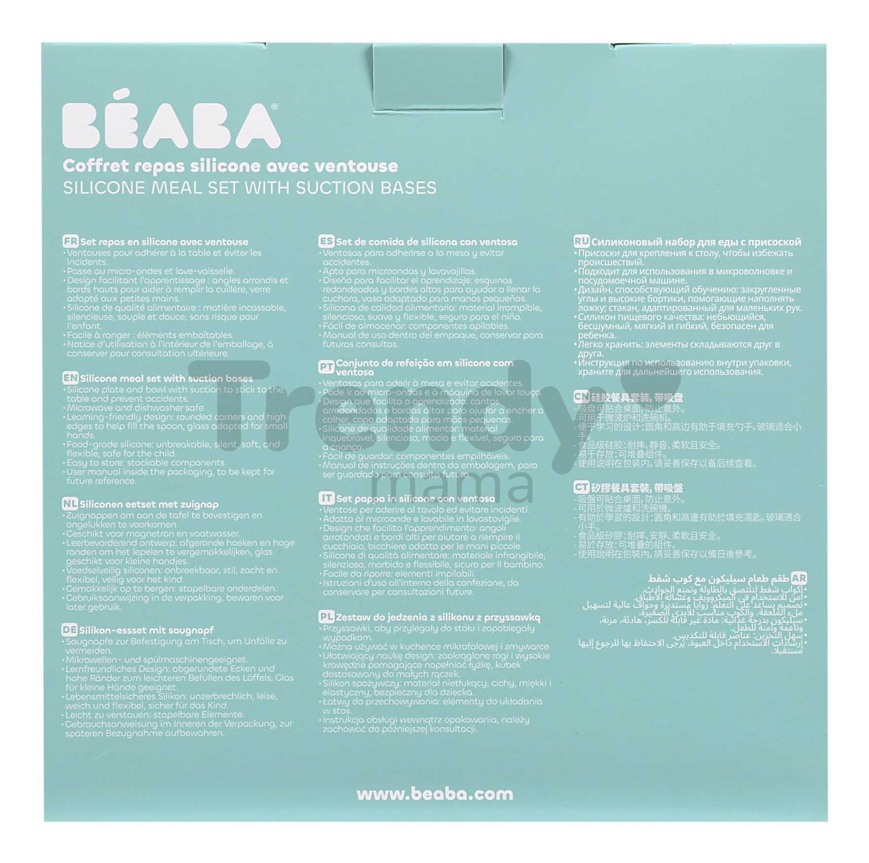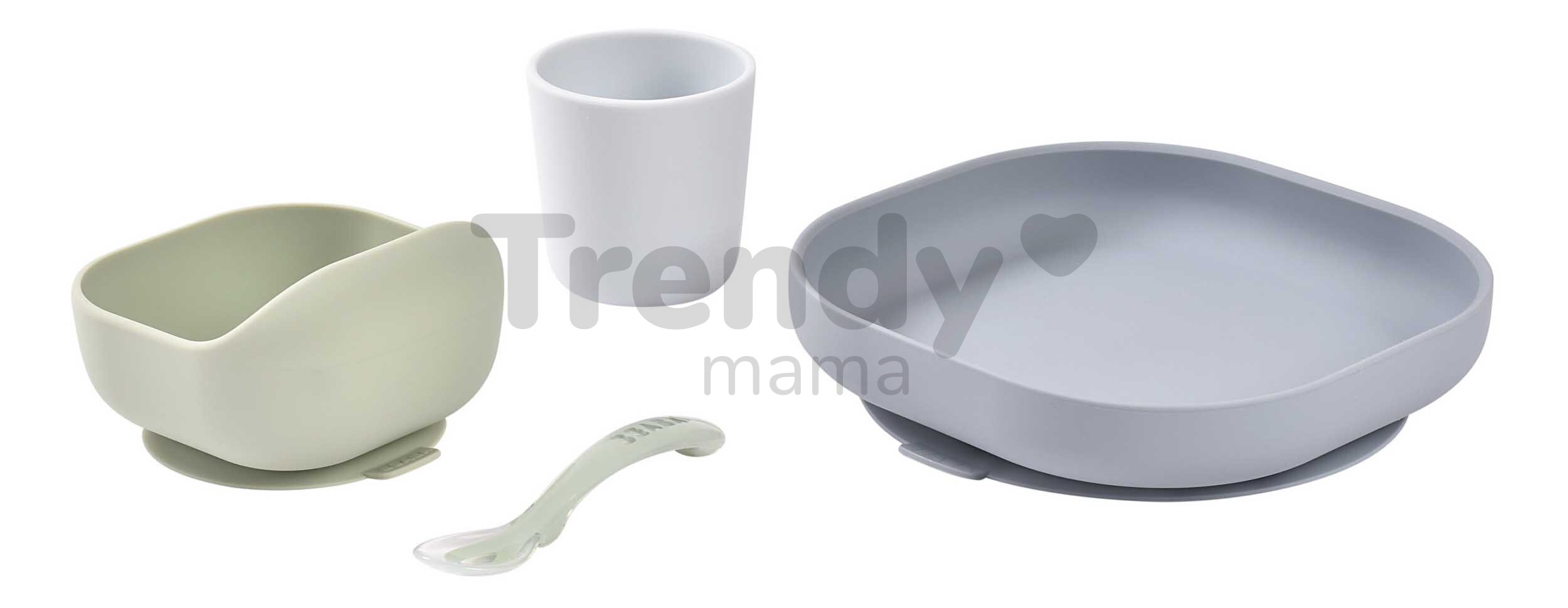 Jedálenská súprava Beaba je špeciálne navrhnutá pre potreby detičiek, ktoré začínajú samostatne jesť a je vhodná pre bábätká už od 4 mesiacov. Rodičov určite poteší integrovaná prísavka na tanieri a miske, ktorá pomôže predchádzať nehodám a riady udrží pevne na stole alebo jedálenskej stoličke. Celá jedálenská súprava je vyrobená z vysokokvalitného potravinárskeho silikónu, ktorý je mäkký, flexibilný, nerozbitný a neobsahuje BPA, PVC ani ftaláty. Silikónovú jedálenskú súpravu môžete umývať ručne použitím špongie alebo v umývačke riadu a je vhodná aj do mikrovlnnej rúry.