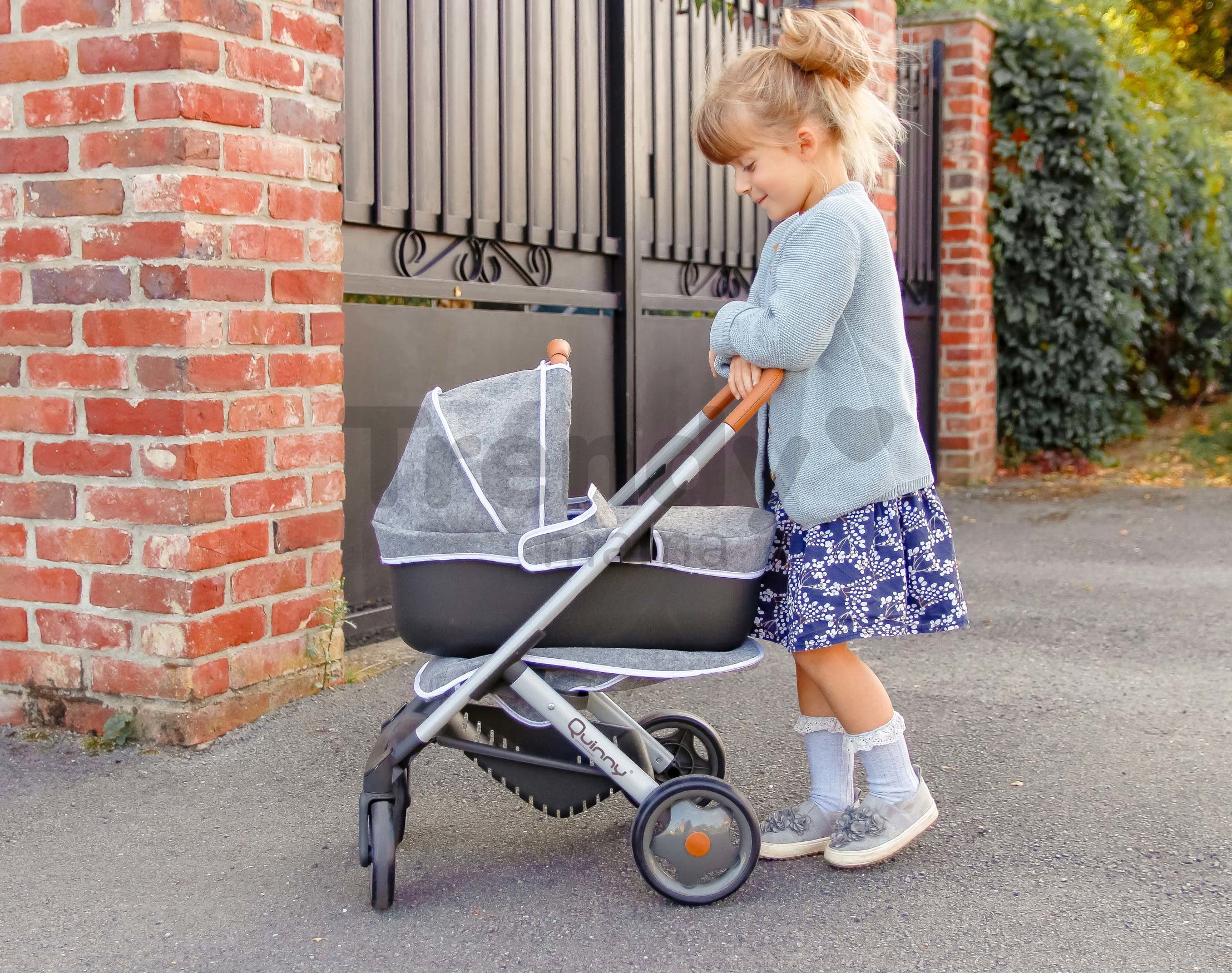 Kočík Smoby DeLuxe Maxi Cosi & Quinny 3v1 je vynikajúci kočík pre bábiku, ktorý sa dá poskladať na 3 rôzne spôsoby: tradičný hlboký kočík, športový kočík – bugina alebo ho dievčatko využije ako nosítko pre bábiku, v ktorom môže bábika spať. Dievčenský kočiar je vyhotovený v nadčasovej a modernej sivej farbe v kombinácii s hnedou, ktorá imituje drevo a čiernou. Hračka pre dievčatá je výborný doplnok starostlivosti o bábiku, pretože malé dievčatká sa rady o svoju bábiku starajú ako o vlastné bábätko. Vďaka kočíku Smoby sa s ňou môžu prechádzať po čerstvom vzduchu, uspávať ju v kolíske alebo v postieľke. Kočík je ako stvorený pre bábiku s výškou 42 cm. Aby bola detská bábika počas prechádzok v bezpečí, v sedacej časti kočíka je bezpečnostný pás. Plastové sedadlo je potiahnuté špeciálnym textilom.