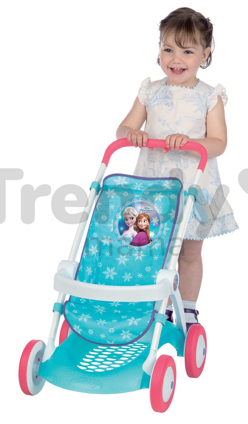Športový kočík pre bábiku Frozen je moderná dievčenská hračka, ktorej neodolá žiadna malá princezná. Kočík pre dievčatká má žiarivú modrú farbu s potlačou bielych snehových vločiek a obrázkom princezien Elsy a Anny z rozprávky Frozen - Ľadové kráľovstvo. V prednej časti je opierka, aby bábika bola počas jazdy na kočíku v bezpečí. Kovová konštrukcia kočiara je biela s ružovou rukoväťou vo výške 58 cm od zeme. Pod sedačkou sa nachádza plastový košík modrej farby, ktorý malej mamičke poslúži na drobnosti, ktoré potrebuje k starostlivosti o bábiku.