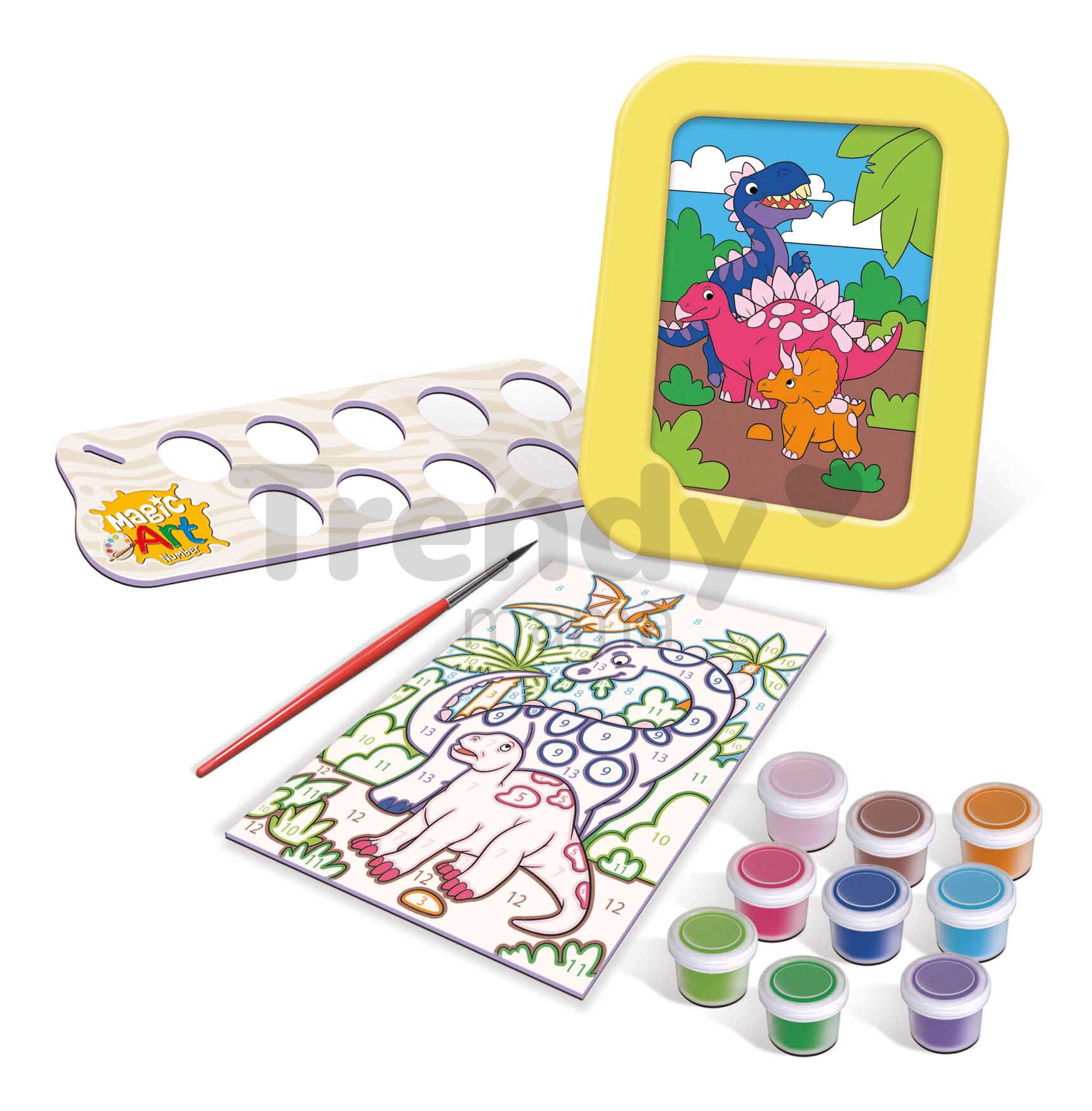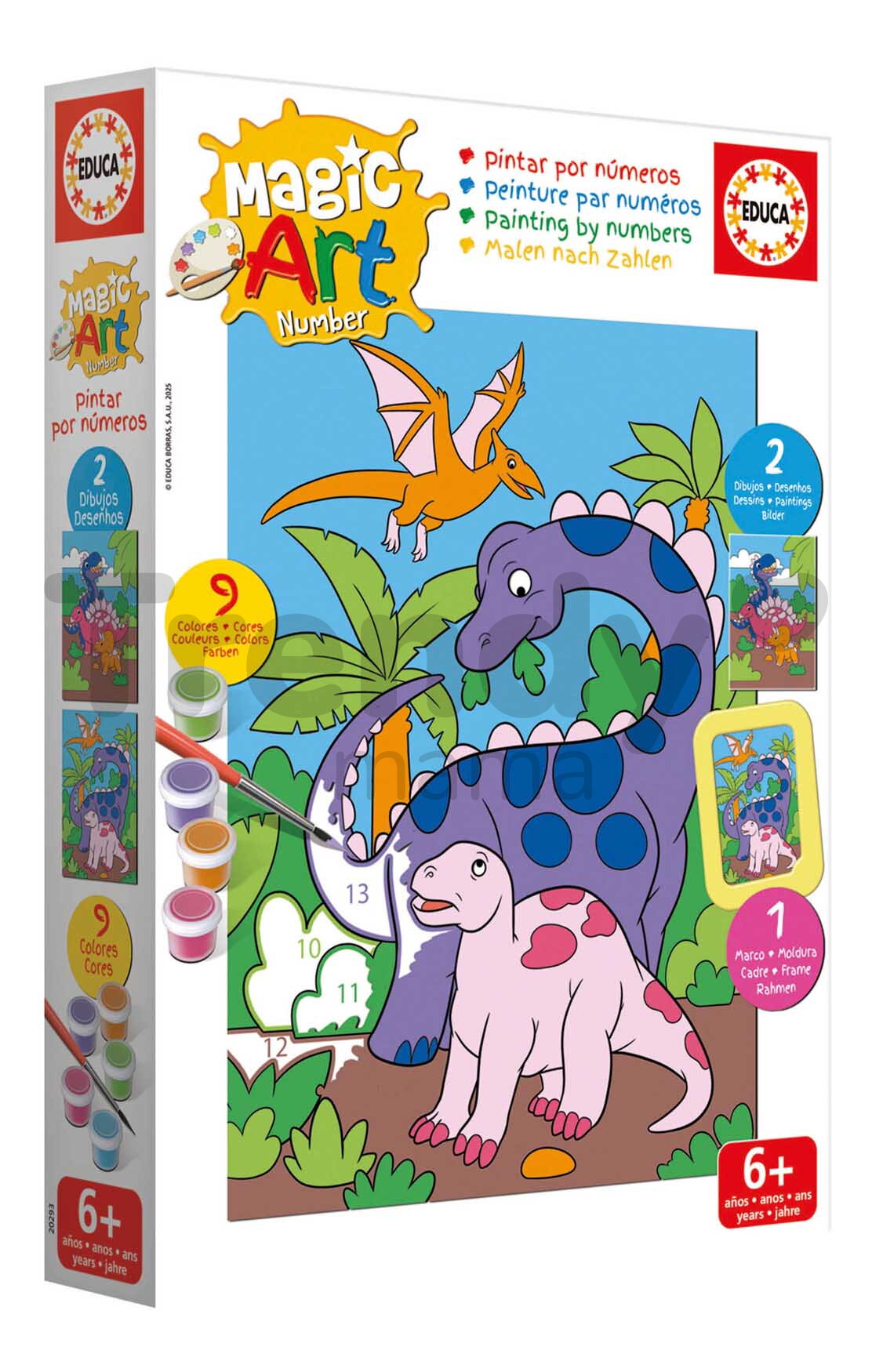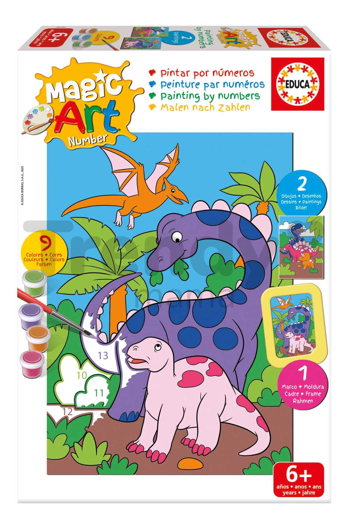 Maľovanie podľa čísiel Svet dinosaurov Magic Art Number od španielskeho výrobcu Educa predstavuje originálny darček pre chlapcov a dievčatá už od 6 rokov. Deti potešia 2 obrázky s motívom dinosaurov, ktoré sa naučia vymaľovať podľa čísiel - obrázky sú predkreslené a označené číslami a líniami, ktoré zodpovedajú určitej farbe. Kreatívna sada na maľovanie obsahuje 9 farieb v dózach s paletou, štetec a rámik, do ktorého si deti vložia vymaľovaný obrázok. Kreatívna sada na maľovanie podľa čísiel pomôže deťom spoznávať čísla a jednotlivé farby, maľovaním si trénujú pozornosť, koordináciu a sústredia sa na detaily.