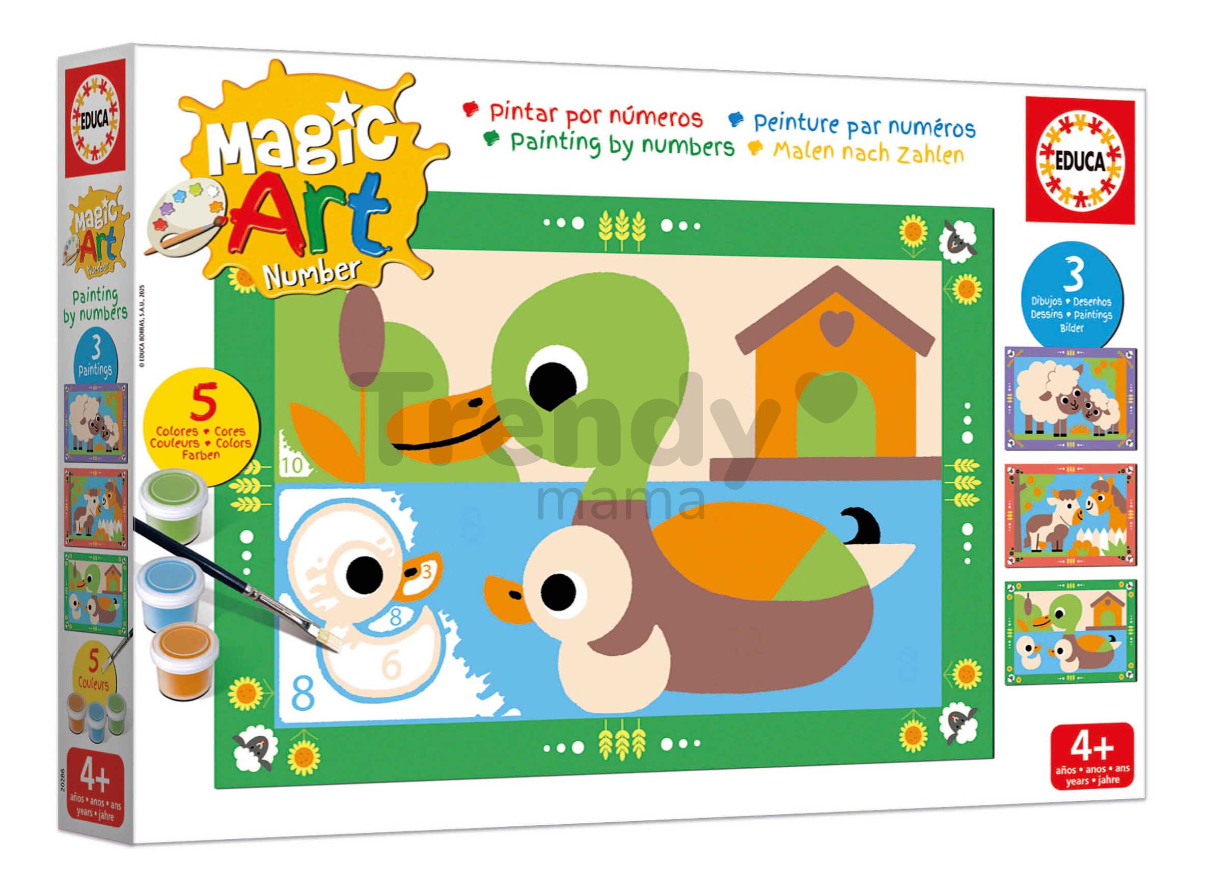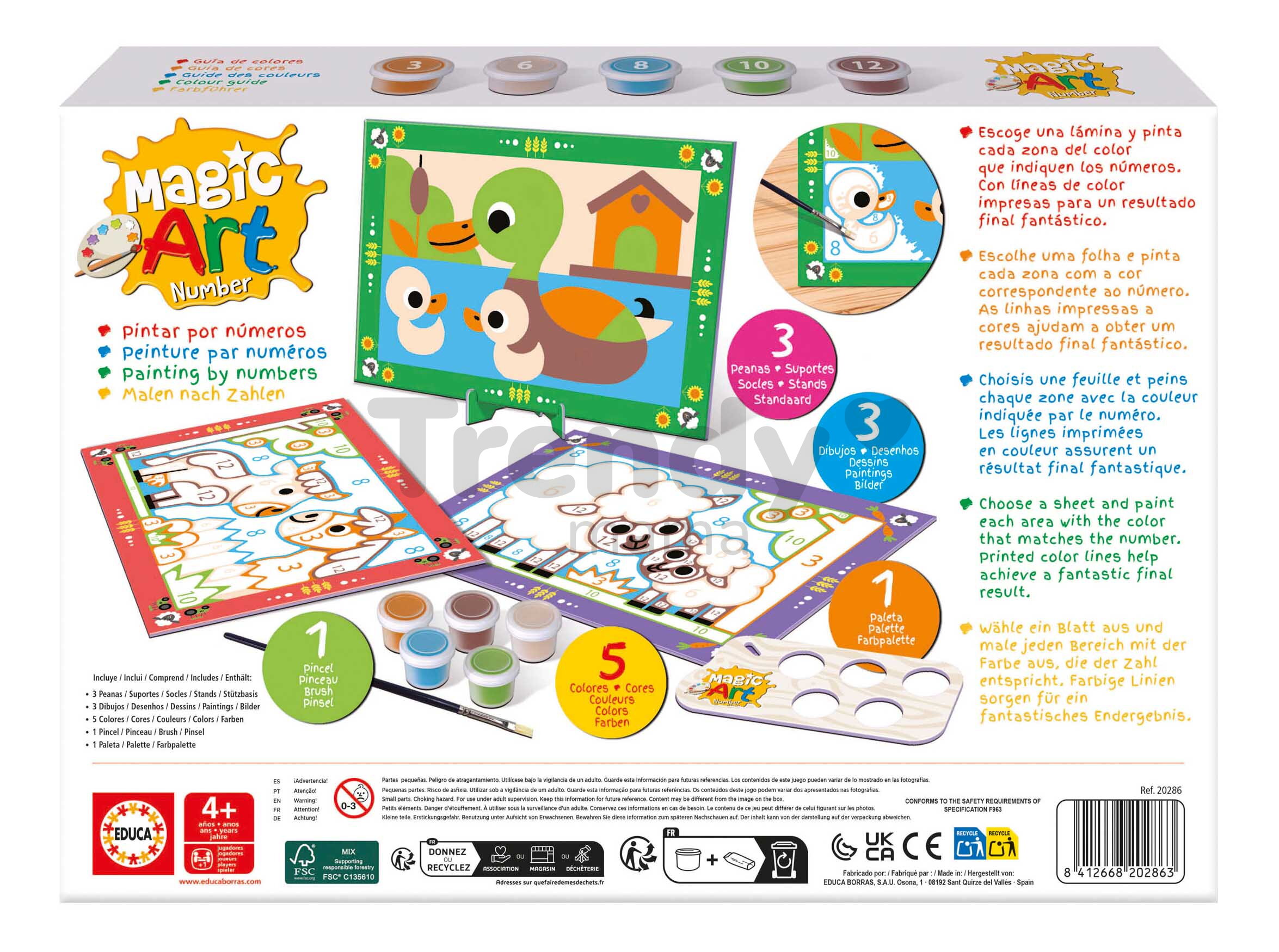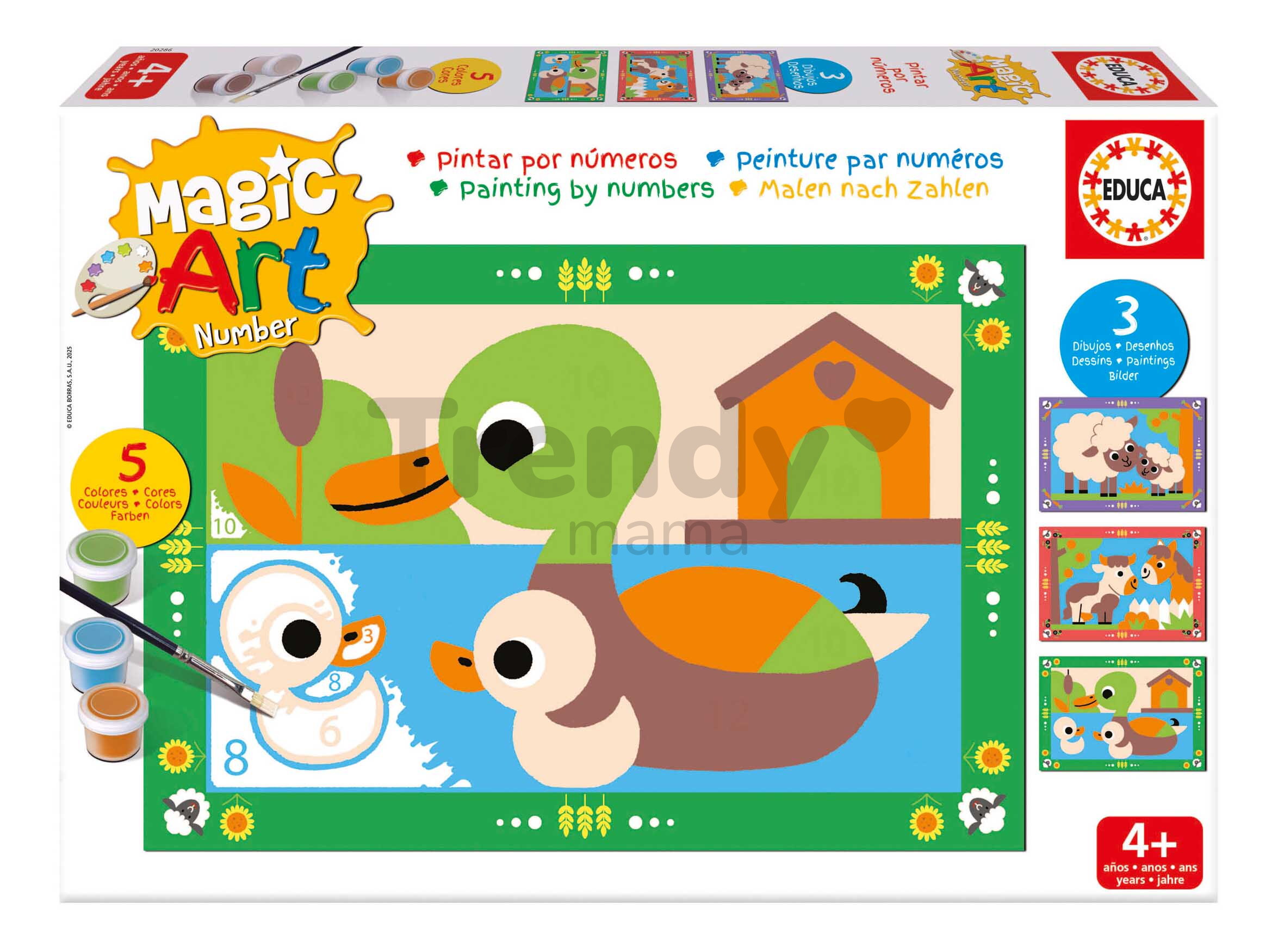 Maľovanie podľa čísiel Farm Magic Art Number od španielskeho výrobcu Educa predstavuje vynikajúci darček pre chlapcov a dievčatá už od 4 rokov. Deti potešia 3 obrázky s motívom zvieratiek na farme, ktoré sa naučia vymaľovať podľa čísiel - obrázky sú predkreslené a označené číslami a líniami, ktoré zodpovedajú určitej farbe. Kreatívna sada na maľovanie obsahuje 5 farieb v dózach s paletou, štetec a stojany, na ktoré si deti vystavia hotové obrázky. Maľovanie podľa čísiel pomôže deťom spoznávať čísla a jednotlivé farby, kreatívnym maľovaním si trénujú pozornosť, koordináciu a sústredia sa na detaily.
