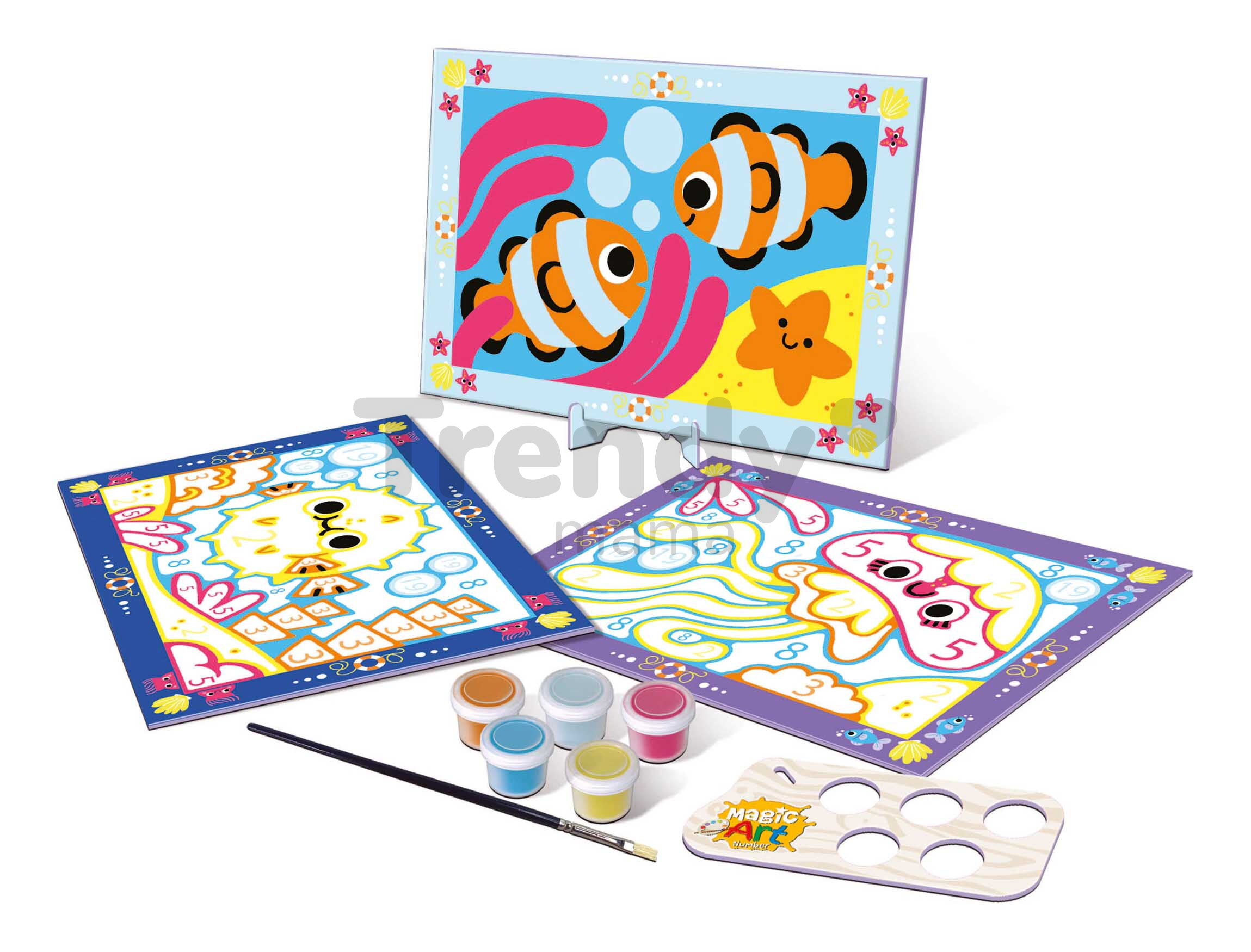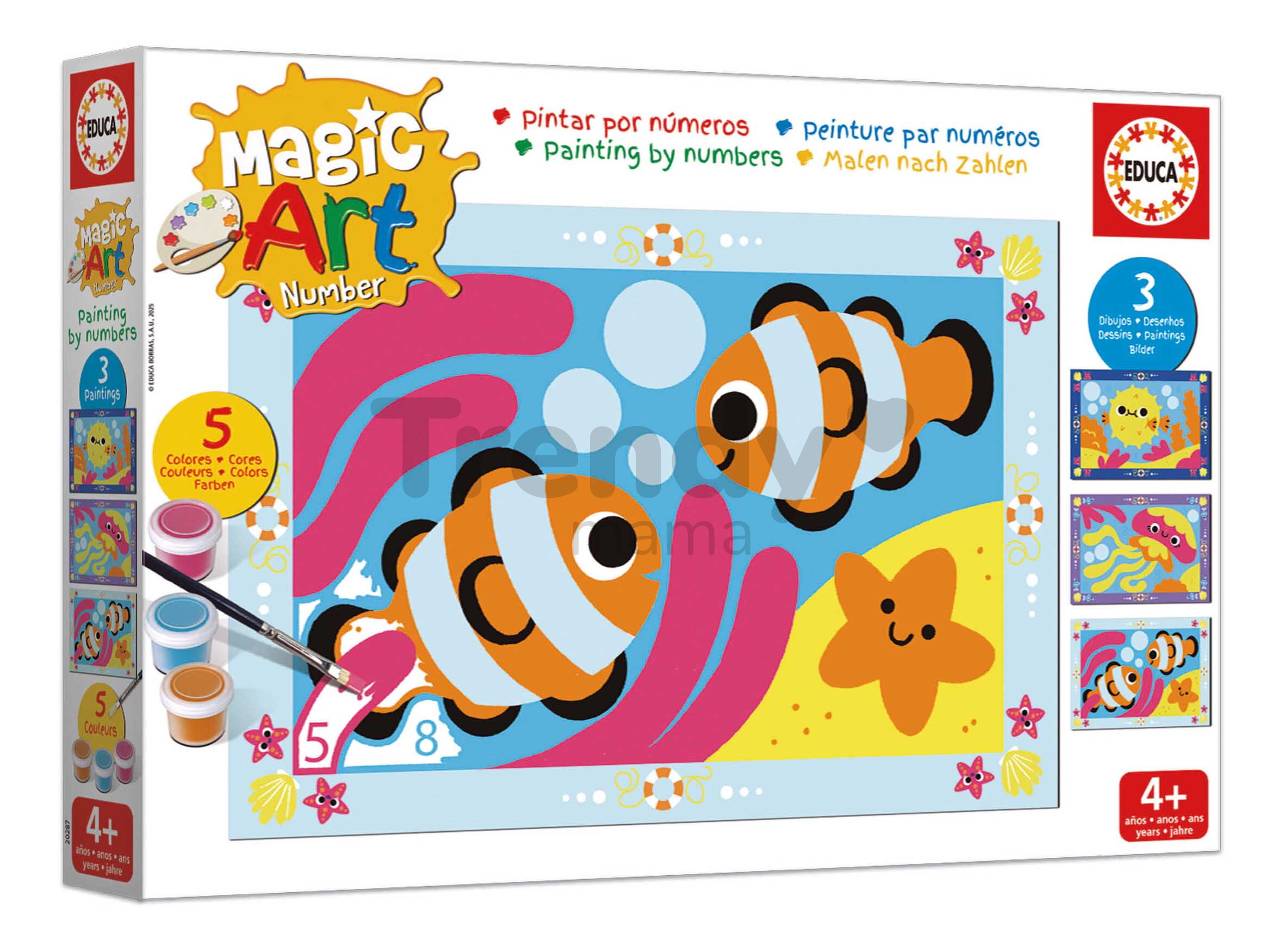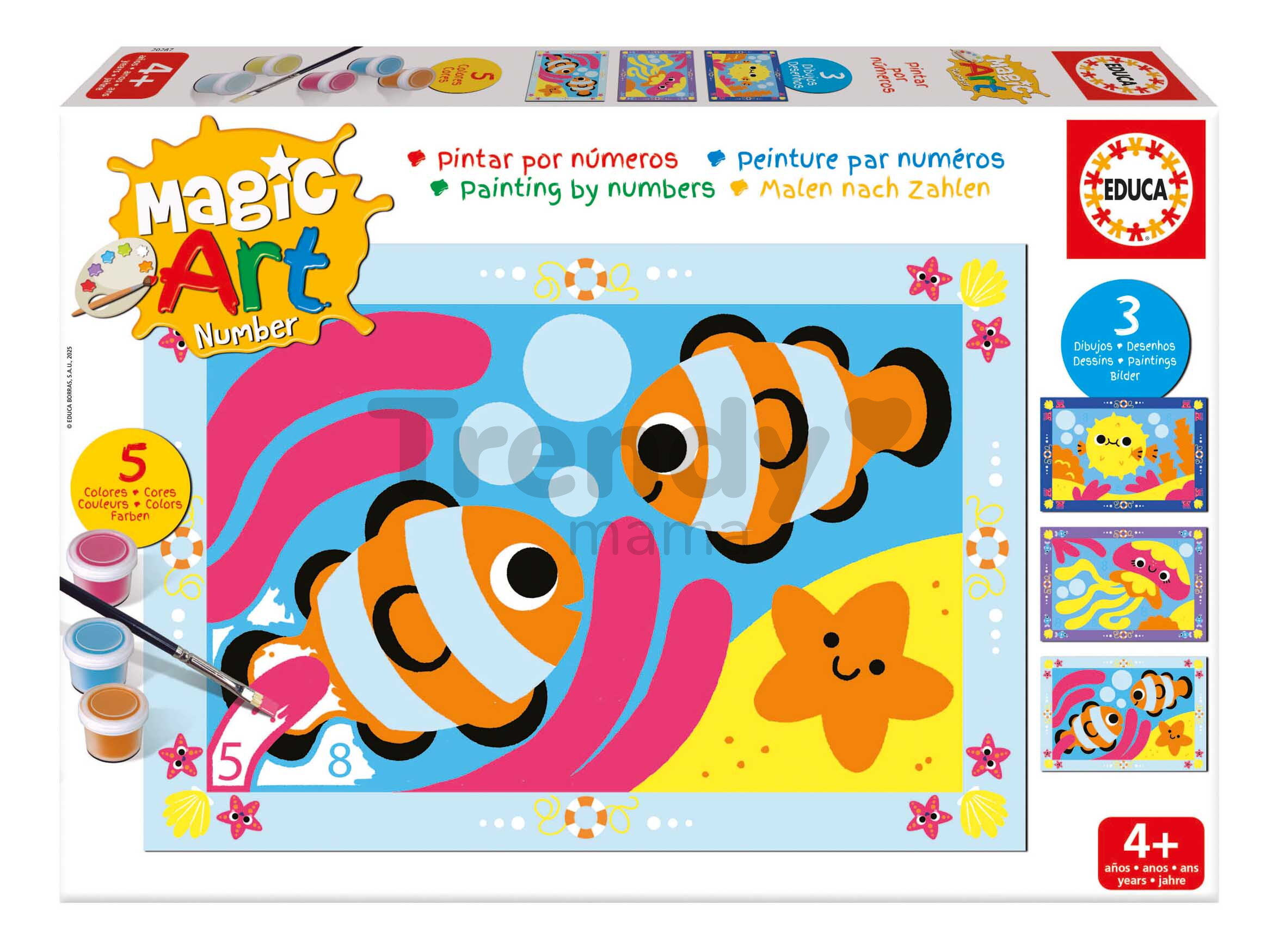 Maľovanie podľa čísiel More Magic Art Number od španielskeho výrobcu Educa predstavuje skvelý darček pre všetky deti od 4 rokov. Chlapcov a dievčatá očaria 3 obrázky s motívom podmorských živočíchov, ktoré sa naučia vymaľovať podľa čísiel - obrázky sú predkreslené a označené číslami a líniami, ktoré zodpovedajú určitej farbe. Kreatívna sada na maľovanie obsahuje 5 farieb v dózach s paletou, štetec a stojany, na ktoré si deti vystavia hotové obrázky. Maľovanie podľa čísiel pomôže deťom spoznávať čísla a jednotlivé farby, kreatívnym maľovaním si trénujú pozornosť, koordináciu a sústredia sa na detaily.