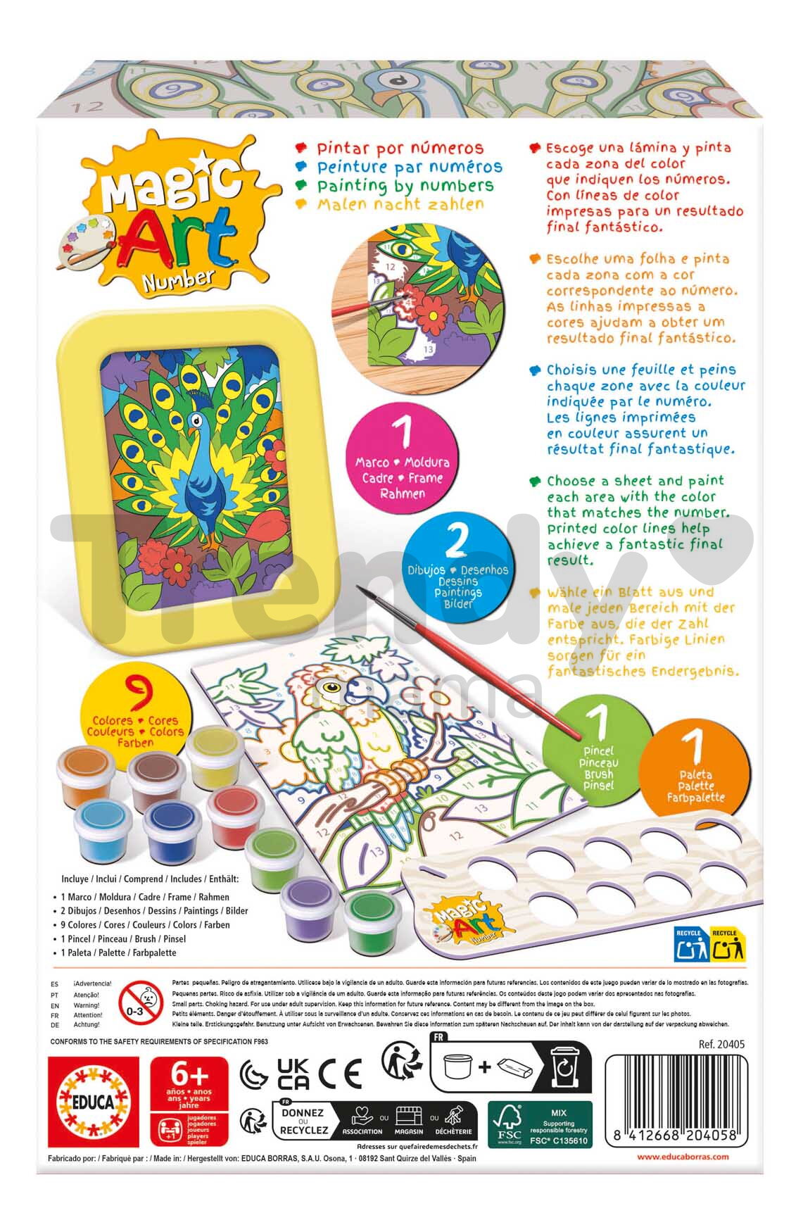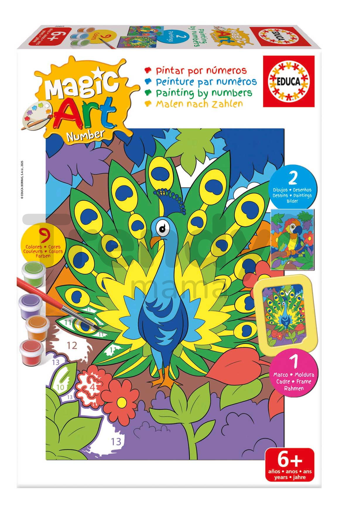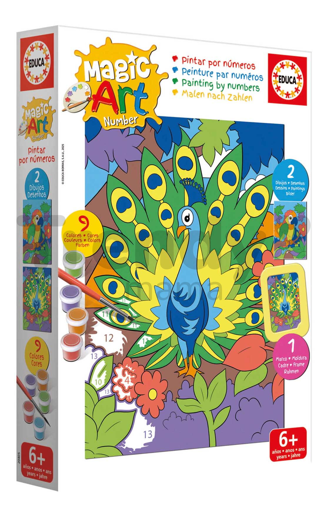 Maľovanie podľa čísiel Peacock & Parrot Magic Art Number od španielskeho výrobcu Educa predstavuje originálny darček pre chlapcov a dievčatá už od 6 rokov. Deti potešia 2 obrázky s motívom papagája a páva, ktoré sa naučia vymaľovať podľa čísiel - obrázky sú predkreslené a označené číslami a líniami, ktoré zodpovedajú určitej farbe. Kreatívna sada na maľovanie obsahuje 9 farieb v dózach s paletou, štetec a rámik, do ktorého si deti vložia vymaľovaný obrázok. Kreatívna sada na maľovanie podľa čísiel pomôže deťom spoznávať čísla a jednotlivé farby, maľovaním si trénujú pozornosť, koordináciu a sústredia sa na detaily.