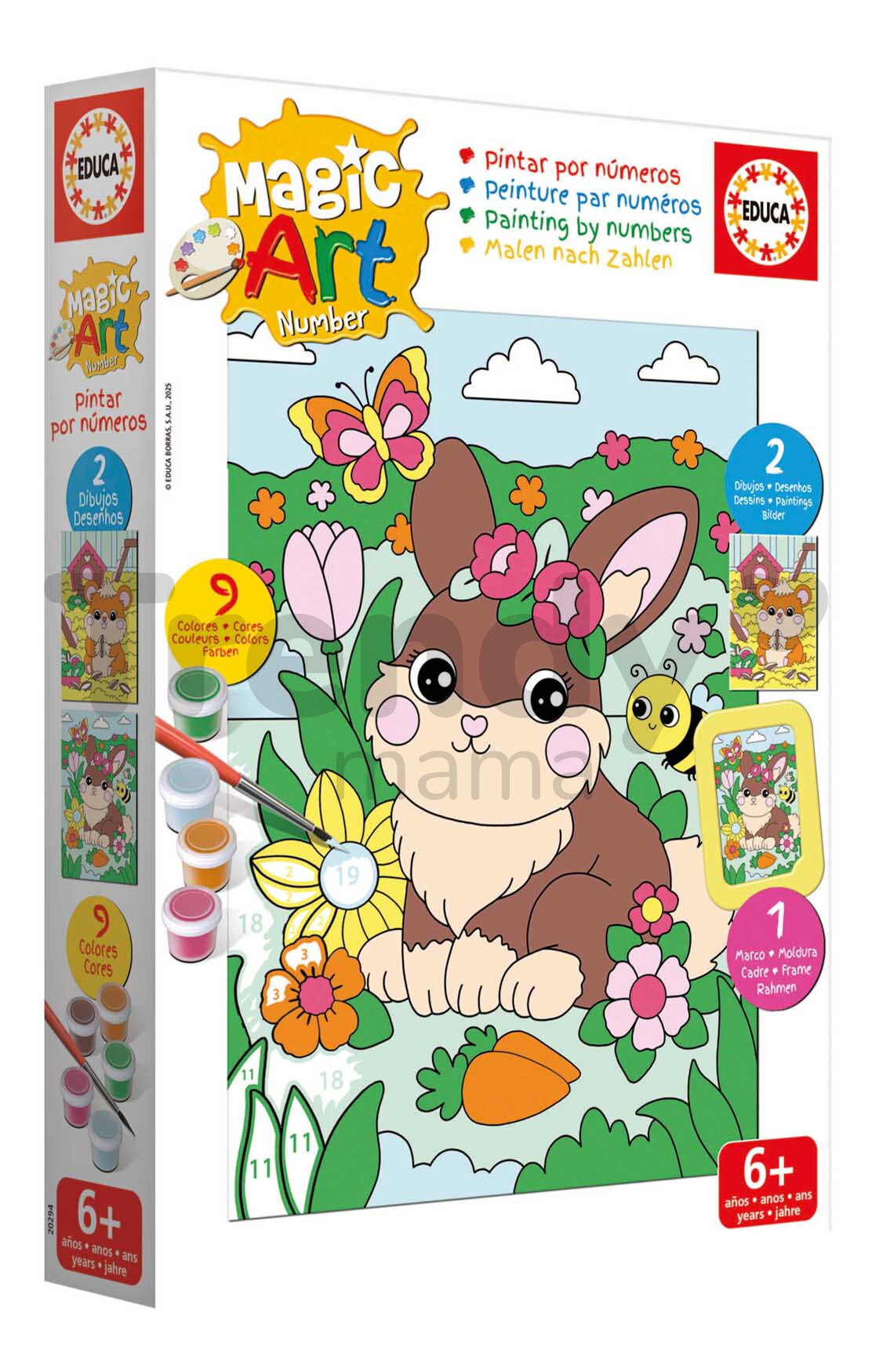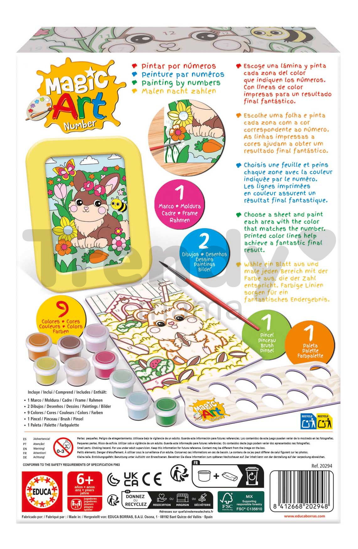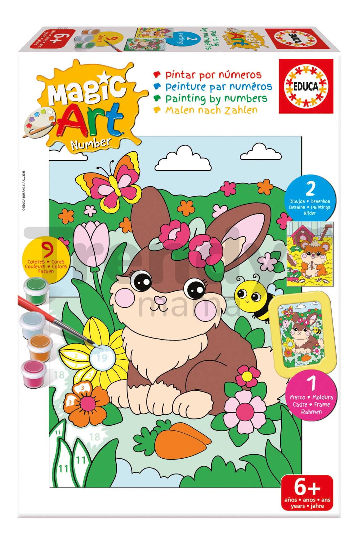 Maľovanie podľa čísiel Pets Magic Art Number od španielskeho výrobcu Educa predstavuje originálny darček pre chlapcov a dievčatá už od 6 rokov. Deti potešia 2 obrázky s motívom zvieratiek, ktoré sa naučia vymaľovať podľa čísiel - obrázky sú predkreslené a označené číslami a líniami, ktoré zodpovedajú určitej farbe. Kreatívna sada na maľovanie obsahuje 9 farieb v dózach s paletou, štetec a rámik, do ktorého si deti vložia vymaľovaný obrázok. Kreatívna sada na maľovanie podľa čísiel pomôže deťom spoznávať čísla a jednotlivé farby, maľovaním si trénujú pozornosť, koordináciu a sústredia sa na detaily.