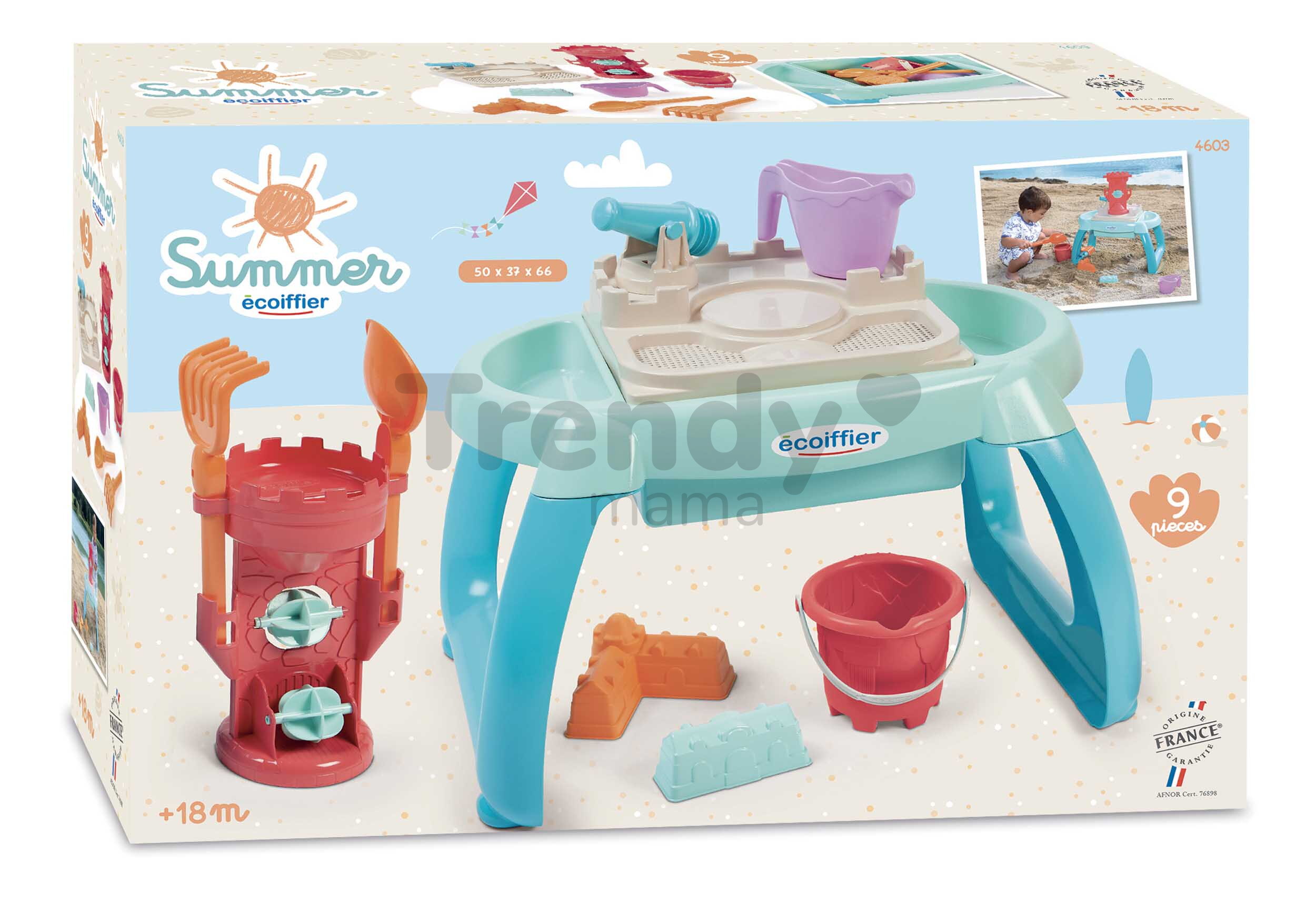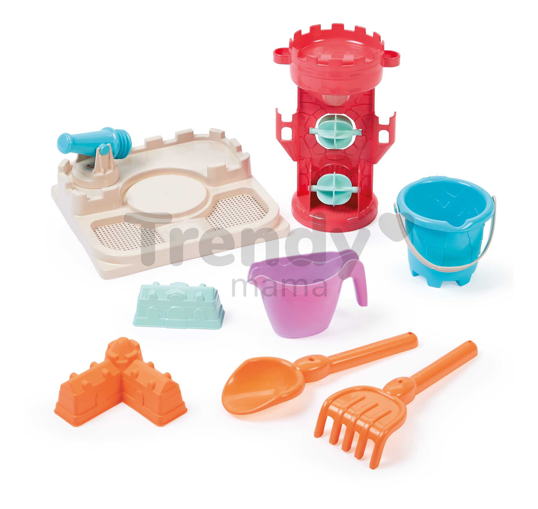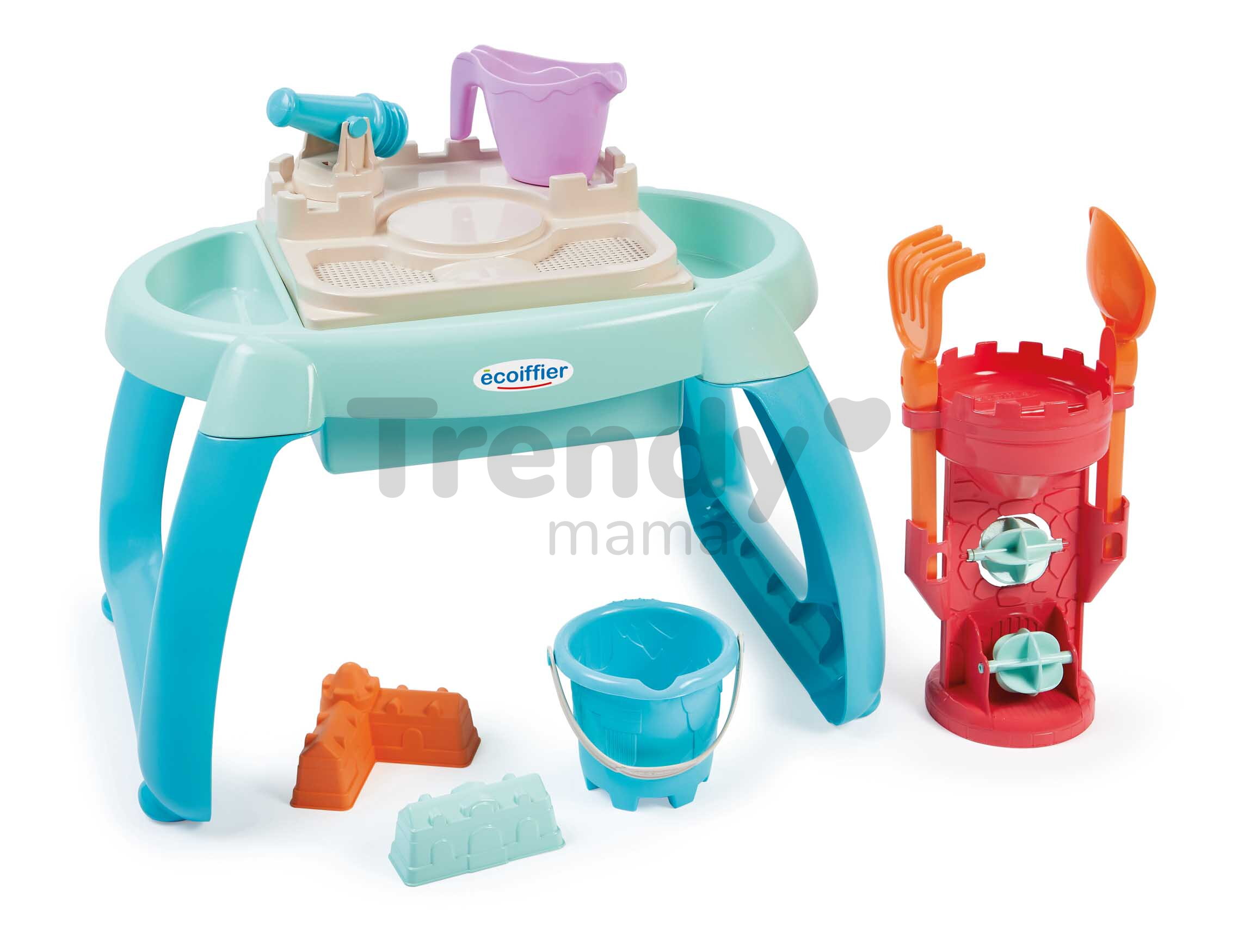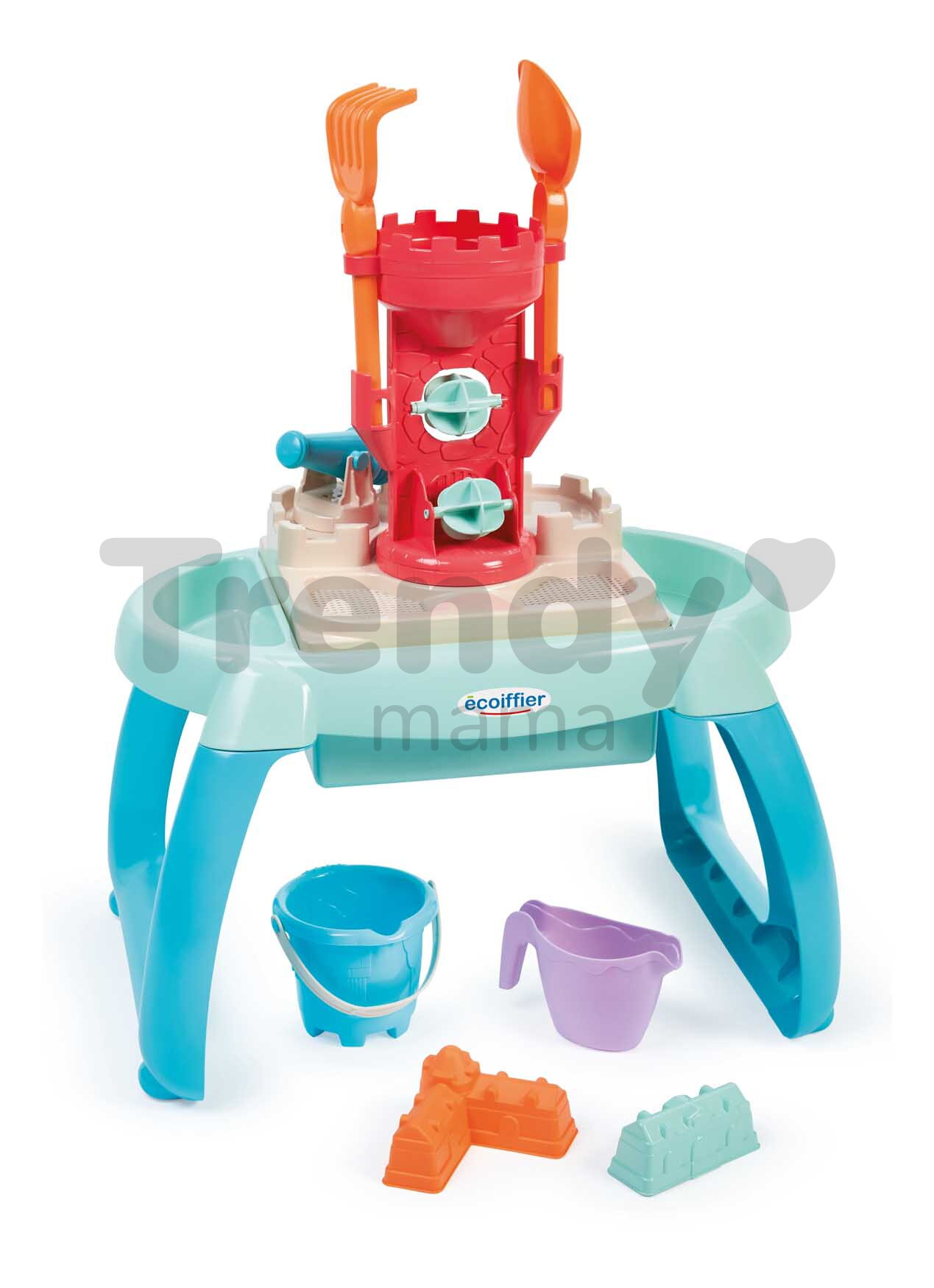 Stolík na vodu a piesok Sand&Water od franúczskej značky Écoiffier je prvotriedna hračka pre chlapcov a dievčatá od 18 mesiacov. Stolík na piesok a vodu očarí deti nádherným dizajnom a sadou doplnkov, s ktorými sa deťmi zabavia na dlhý čas. Tešiť sa môžu na vedierko, krhličku, 2 formičky v tvare hradieb, hrabličky, lopatku a kanón. Detský stolík pripomína detský hrad, tento dojem umocňuje aj strážna veža s 2 mlynmi, cez ktoré môže dieťa liať vodu. Jednotlivé časti stolíka sú odnímateľné, dieťa môže stolík naplniť vodou alebo pieskom.