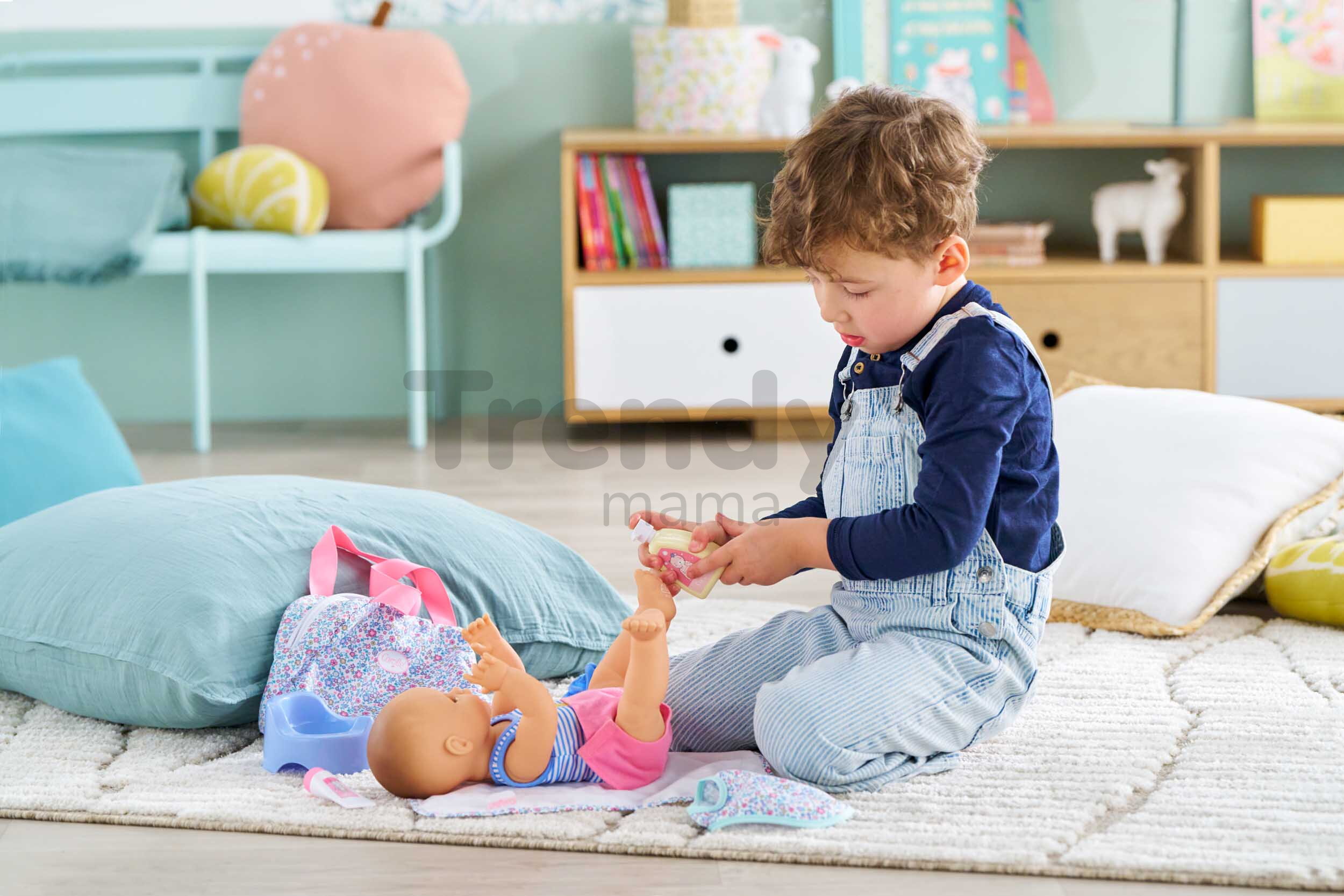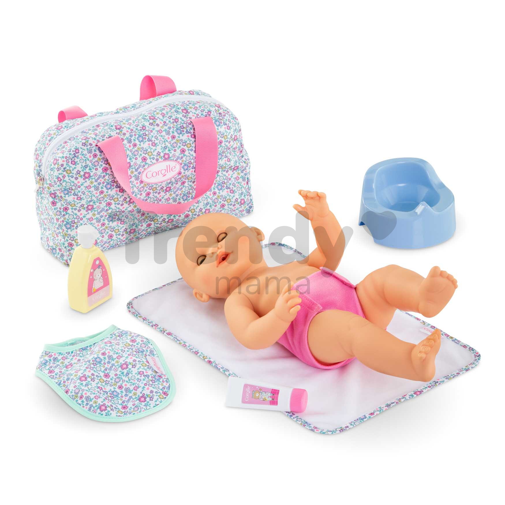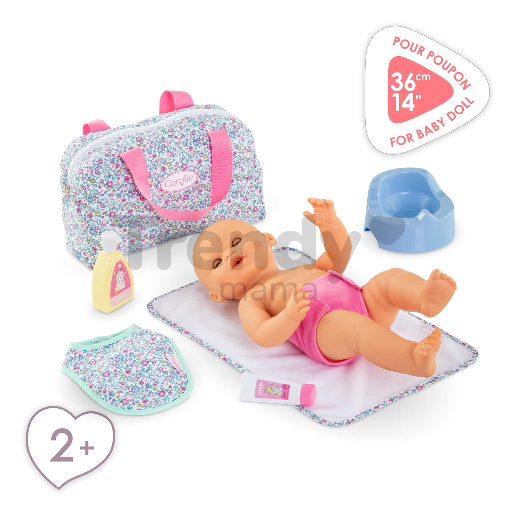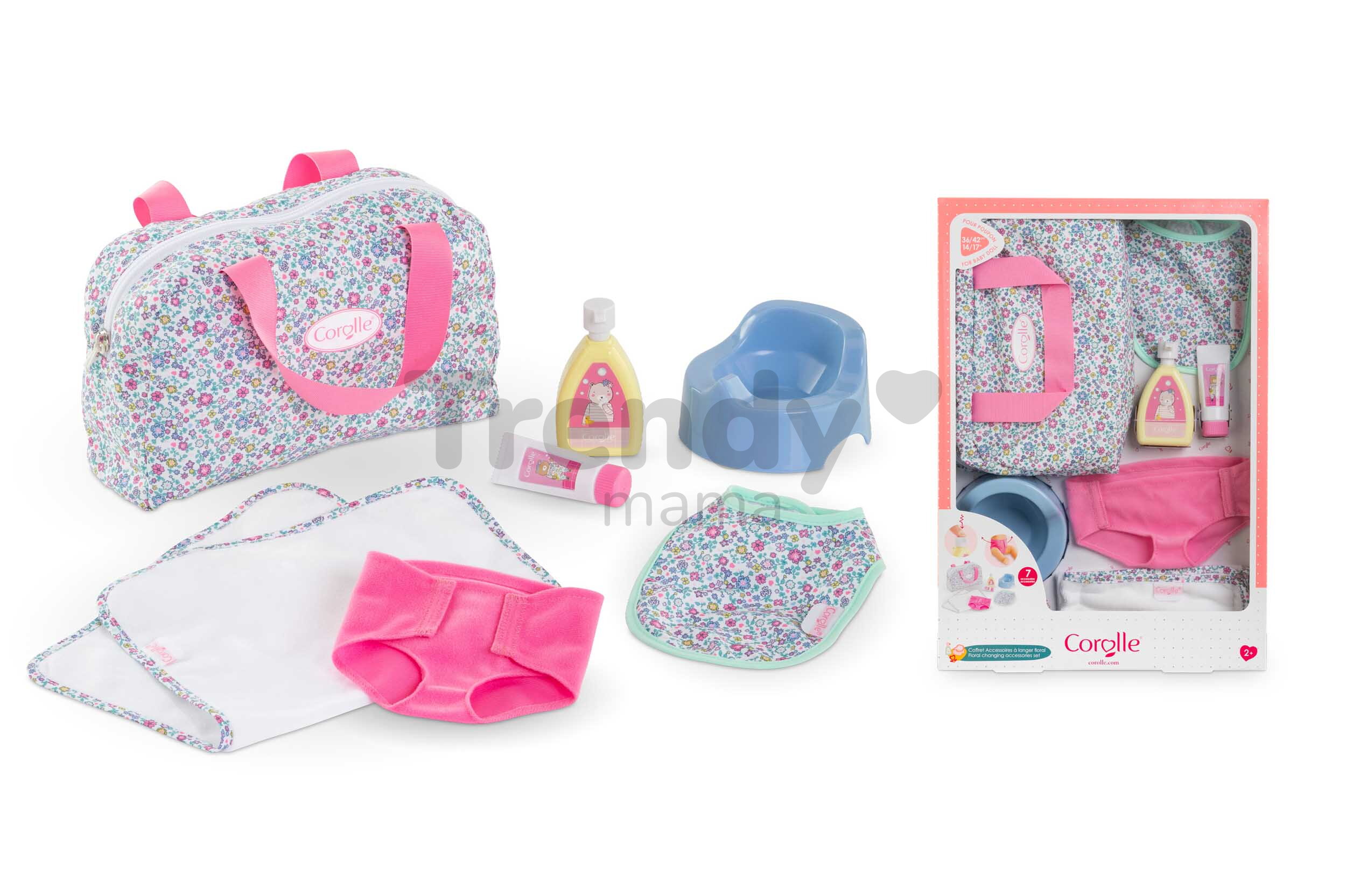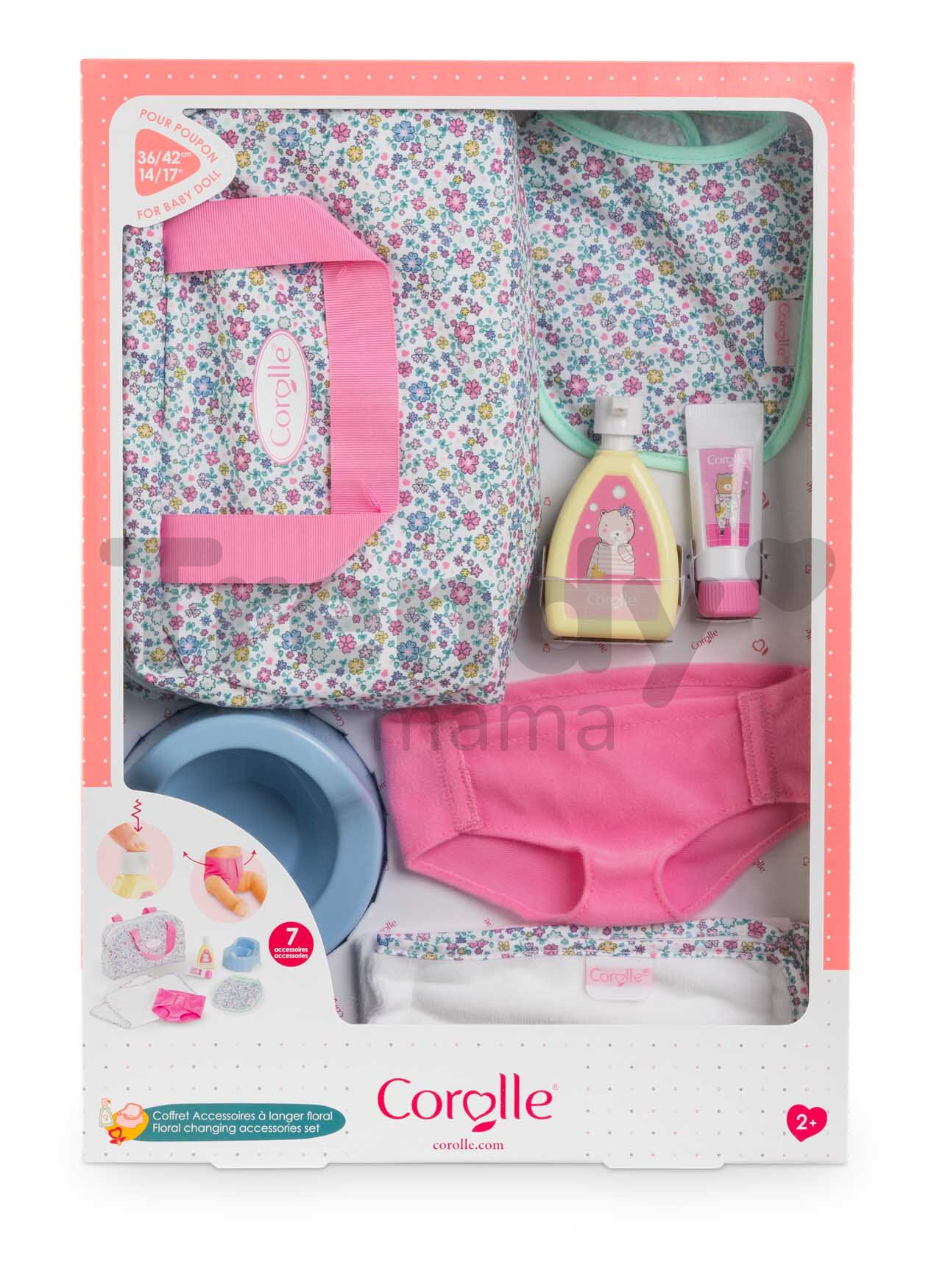 Prebaľovacia taška pre bábiku Flowered Changing Accessories Set z dielne francúzskej značky Corolle premení každú hru s bábikou na neuveriteľný zážitok. Táto 7-dielna súprava na prebaľovanie je určená pre bábiky s veľkosťou 36 cm a spestrí hru s milovanou bábikou. V prebaľovacej taške s rozkošným francúzskym dizajnom si detičky od 24 mesiacov nájdu látkovú plienku, nočník, krém, podbradník, telové mlieko a prebaľovaciu podložku. Praktická prebaľovacia taška s doplnkami sa vždy a všade jednoducho premení na prebaľovaciu podložku a starostlivosť o bábiku sa môže začať.