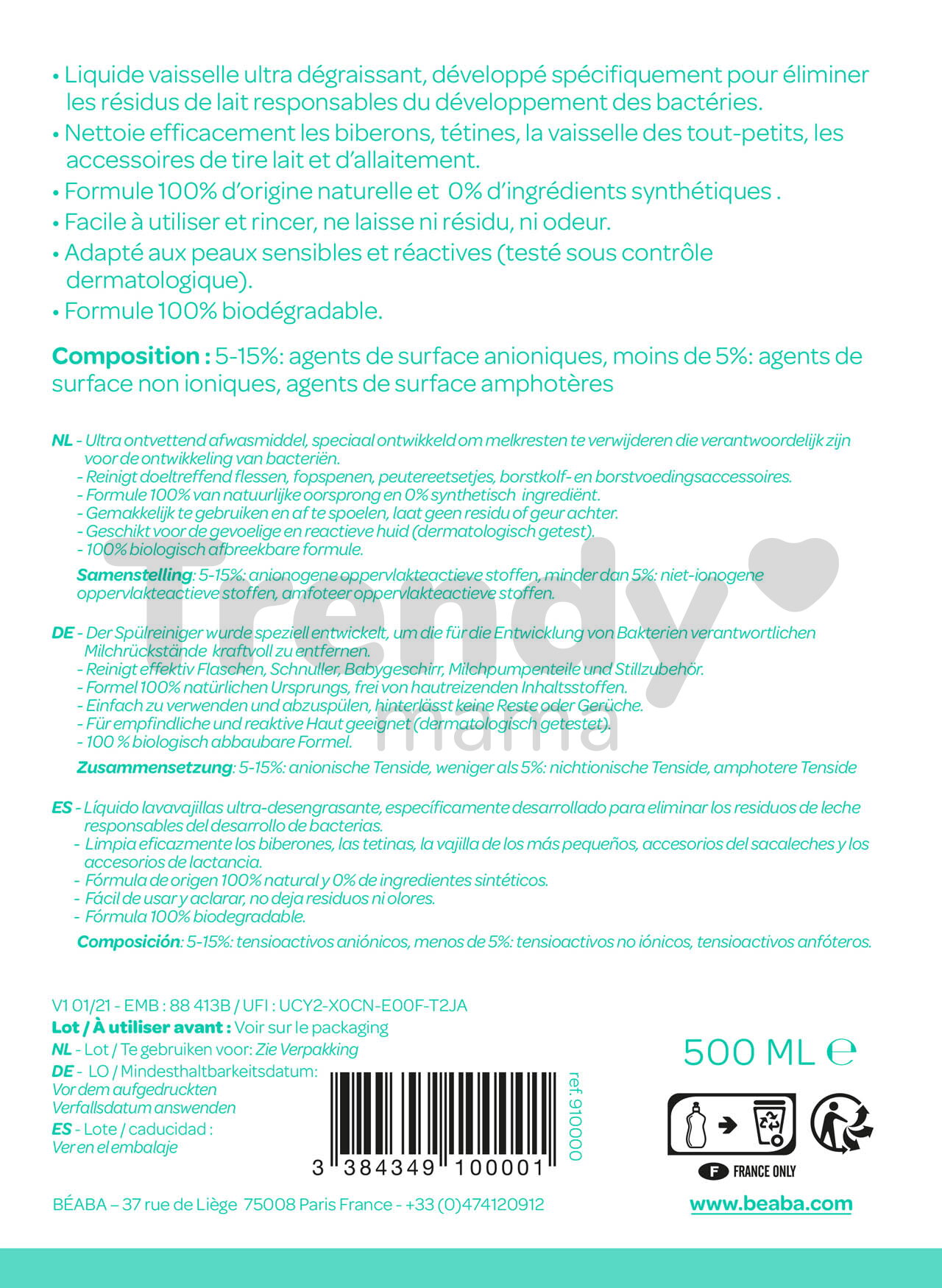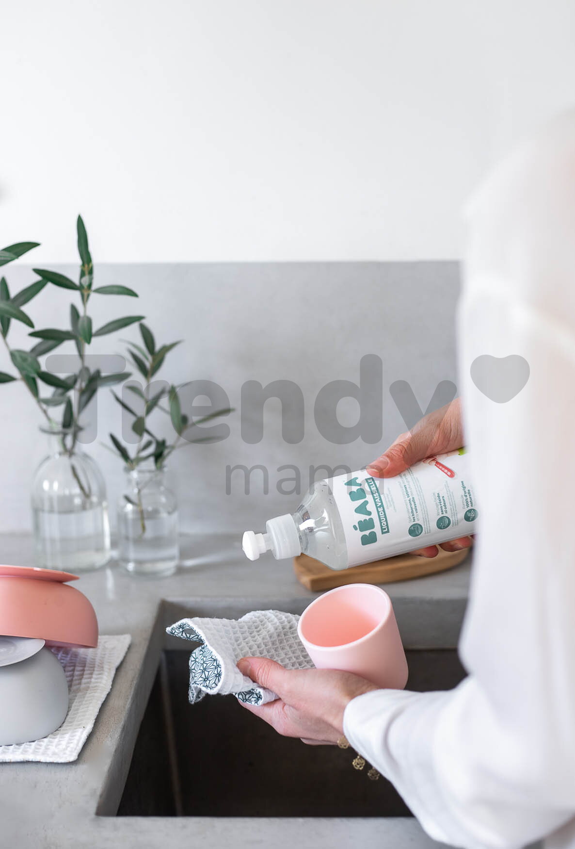 Prípravok na umývanie riadu Beaba porazí v domácnosti s malým bábätkom všetky nečistoty. Spoľahlivo odstráni zvyšky mlieka a jedla a je špeciálne navrhnutý na umývanie cumlíkov, dojčenských fliaš a pomôcok na kŕmenie tých najmenších. Prostriedok na umývanie riadu Washing Up Liquid od Beaba má 100% prírodné zloženie a je nežný k vašej pokožke. Tento ultra odmasťujúci prípravok na riad dokonale vyčistí riad celej rodiny. Ľahko sa oplachuje, na povrchu nezanecháva mastný film či zápach a už vôbec nie zvyšky jedla, ktoré by mohli spôsobiť vznik škodlivých baktérií. Overený čistiaci prostriedok na riad je dermatologicky testovaný a vďaka svojmu zloženiu je šetrný k životnému prostrediu.