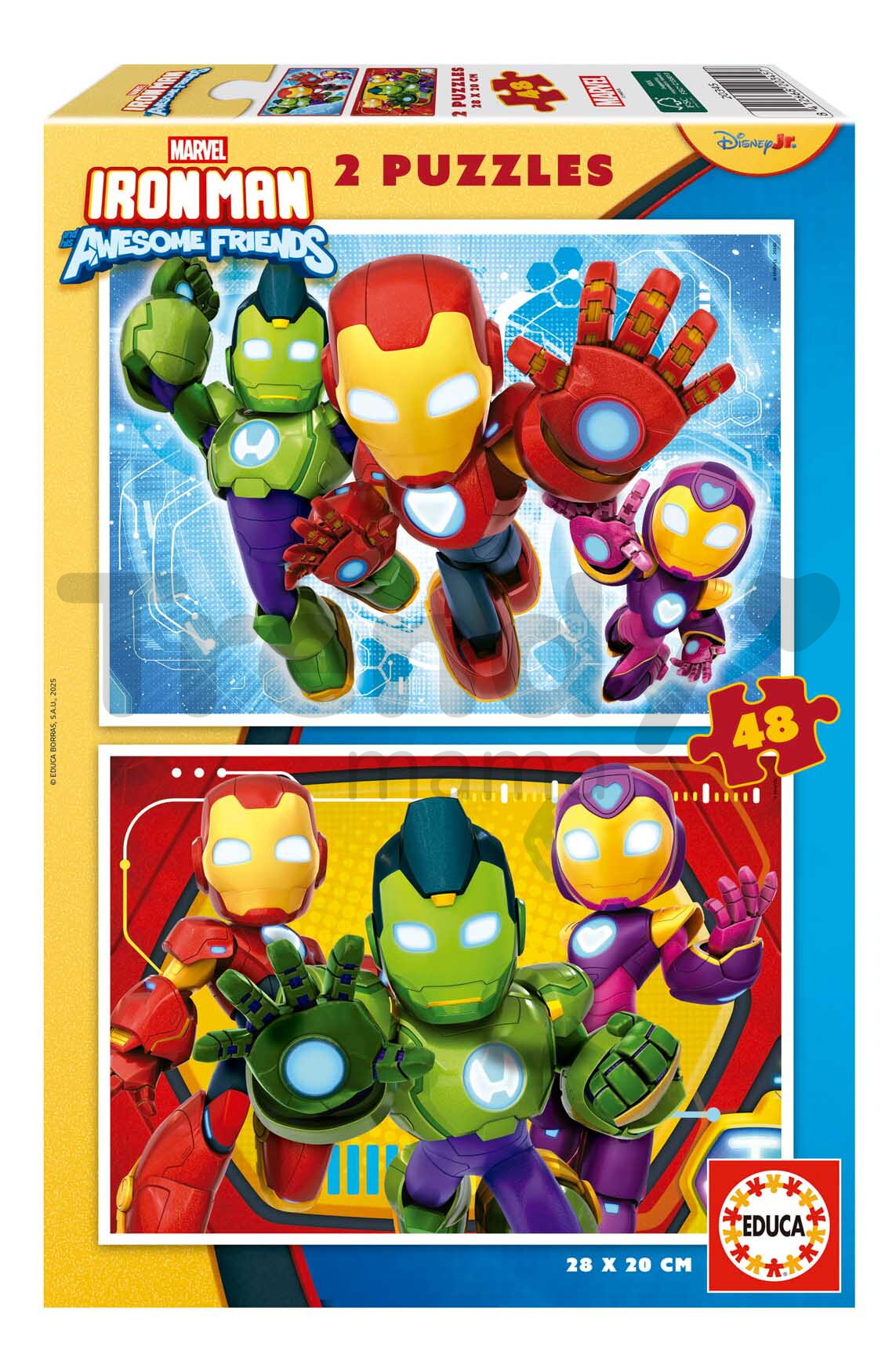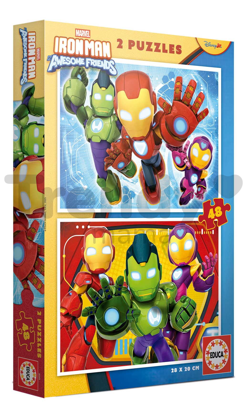 Puzzle Iron Man and His Amazing Friends od španielskeho výrobcu Educa predstavujú skvelý darček pre všetky deti a najmä chlapcov už od 4 rokov. Motív puzzle predstavuje originálne obrázky hrdinov zo sveta Marvel. Balenie týchto puzzle obsahuje 2x48 dielikov. Puzzle po poskladaní tvoria dva obrázky s rozmerom 28*20 cm. Puzzle sú vyrobené z prvotriedneho kartónu. Spĺňajú bezpečnostné štandardy - sú bezpečné pre deti i dospelých. Puzzle sa dajú po poskladaní opäť rozložiť a uložiť späť do krabičky.