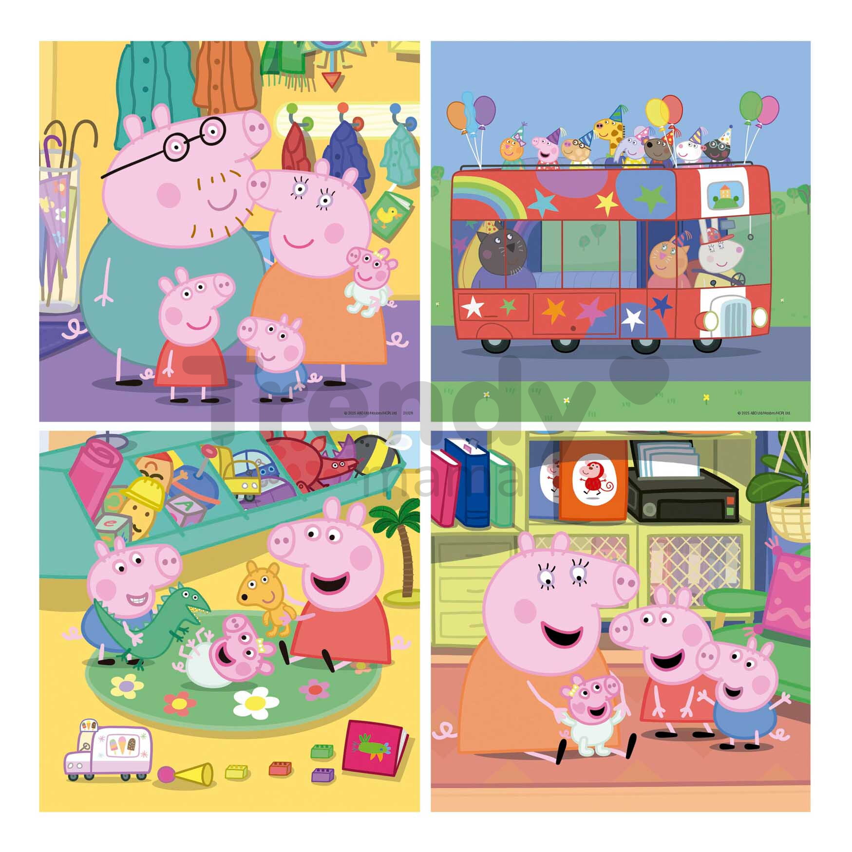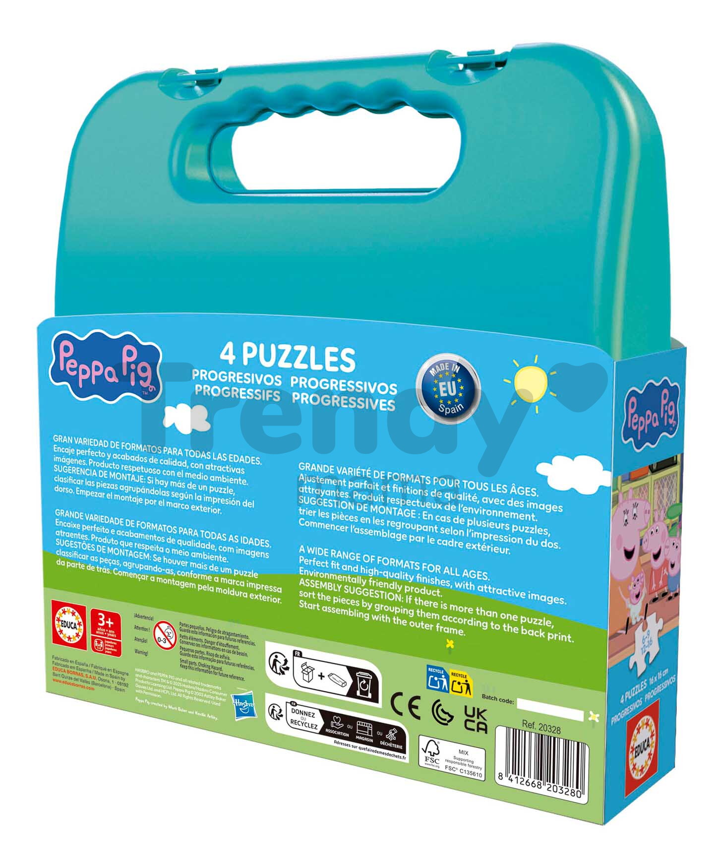 Puzzle v kufríku od španielskeho výrobcu Educa potešia všetkých chlapcov a dievčatá od 3 rokov. Tieto originálne puzzle sú progresívne a detičky si vďaka nim zlepšujú svoje skladacie schopnosti. Obsahujú 4 nádherné obrázky s motívom animovaných prasiatok Peppa Pig, pričom každý z nich má iný počet dielikov. Skladanie puzzle sa začína najjednoduchším obrázkom so 6 dielikmi, potom deti pokročia na puzzle so 9 dielikmi a nasledujú ešte 12 a 16-dielne puzzle. Vďaka tomu si dieťa postupne trénuje zručnosť pri skladaní puzzle a učí sa ich rýchlejšie skladať. Vďaka kufríku si puzzle budú môcť brať kamkoľvek so sebou. Veľkosť každého obrázku je 16*16 cm.