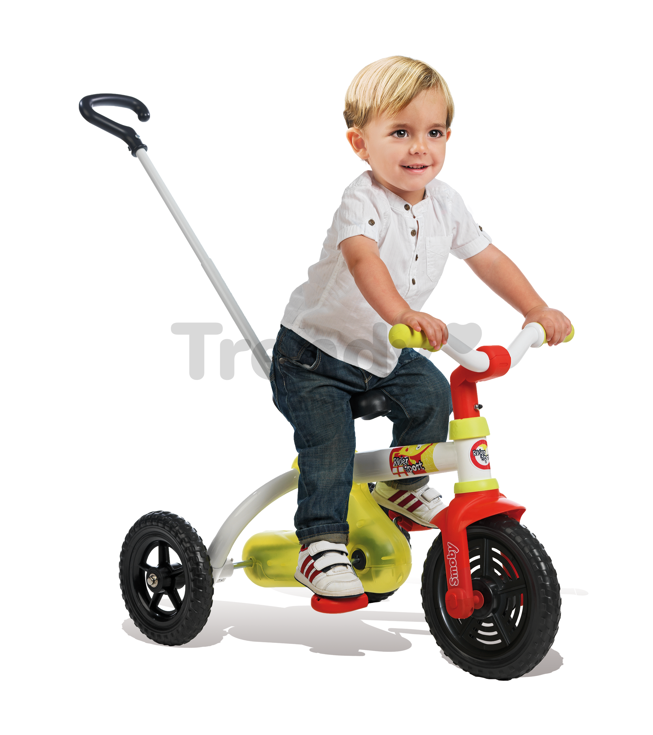Trojkolka pre deti je vyrobená z kvalitných a odolných materiálov. Má pevnú kovovú konštrukciu, v kombinácii s odolnými plastami. Riadidlá trojkolky pre deti sa dajú uzamknúť, aby dieťa nemohlo počas tlačenia meniť smer jazdy. Po odomknutí majú riadidlá 30 stupňovú vôľu do strán. Riadidlá na trojkolke pre deti sa dajú nastaviť do rôznych výšok a polôh. Je to krásna pevná, stabilná a bezpečná trojkolka, s protišmykovými kolesami a tichou jazdou, zdobená športovými nálepkami. Táto tradičná trojkolka na reťazový pohon je vhodná pre deti už od 15 mesiacov, a rastie s ním až do 3 rokov a ďalej. Výška sedadla od zeme je 43 cm. Má nosnosť 30 kg.
