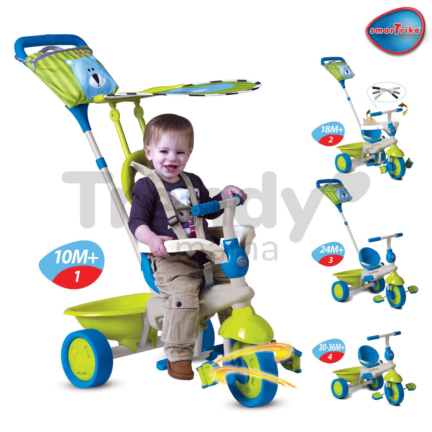 Zažite exotické dobrodružstvo a zábavu s jedinečnou detskou trojkolkou Safari Medveď Touch Steering 4v1. Trojkolka má zabudovanú rodičovskú teleskopickú vodiacu rúčku, pomocou ktorej môže rodič pohodlne usmerňovať jazdu trojkolky. Patentované a kvalitné gumové kolieska trojkolky zaručujú jemnú jazdu a hravo si poradia i s nerovnosťami povrchu. Trojkolka pre deti od výrobcu smarTrike rastie spolu s vašim dieťaťom. Vďaka odnímateľným častiam sa trojkolka šikovne adaptuje potrebám, a veku vášho dieťatka od jeho 10 mesiacov až do 3 rokov. Malí šibali budú novú detskú trojkolku milovať. Technológia Touch Steering umožňuje extra ľahké manévrovanie i v ostrých zákrutách a hladkú jazdu vďaka zabudovanej suspenzii kolies. Vďaka inovatívnej poistke riadenia a skladacím pedálom si užijú plno zábavy ešte predtým ako začnú pedálovať sami.