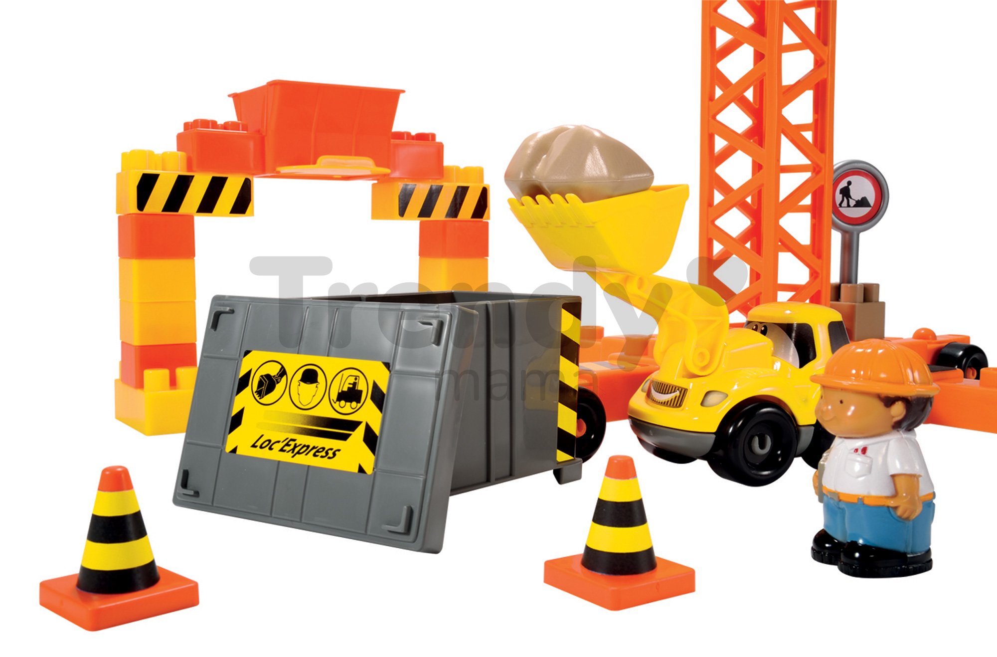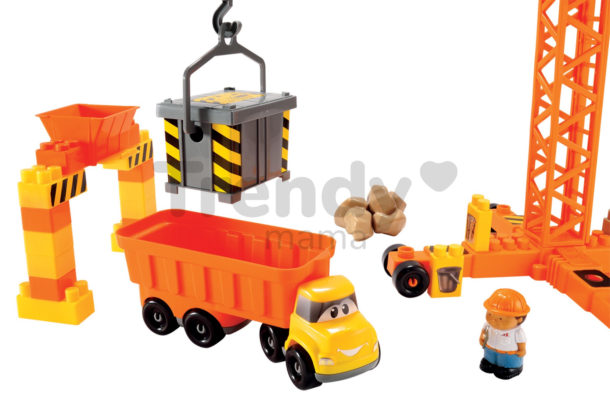 Detská stavebnica Abrick Stavbári na stavbe poteší všetkých chlapcov, ktorí sa radi hrajú s kockami a zároveň obdivujú veľké stavebné stroje. Stavenisko so žeriavom čaká na všetkých malých stavbárov či inžinierov. Écoiffier stavebnica pre deti Abrick obsahuje všetko, čo je pri stavbe nevyhnutné. Malí stavbári majú k dispozícii veľký žeriav s otočným ramenom a kabínkou, bager, nákladné auto, zhŕňač, žeriav, dopravné kužele, stavebný materiál a mnohé iné doplnky, ktoré vytvárajú deťom podnetné herné prostredie. Dieliky stavebníc Abrick sa ľahko skladajú a zároveň ľahko rozkladajú. Rozmery stavebnice sú 36*31*55 cm.