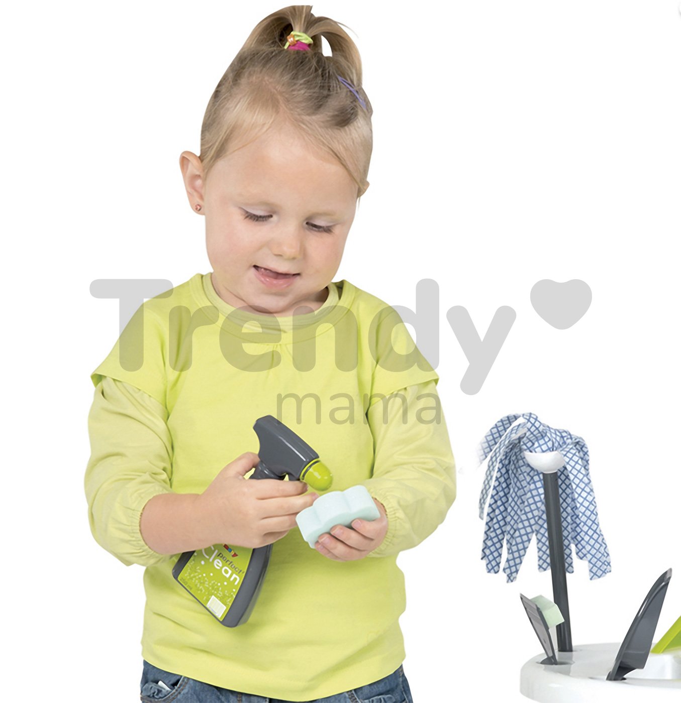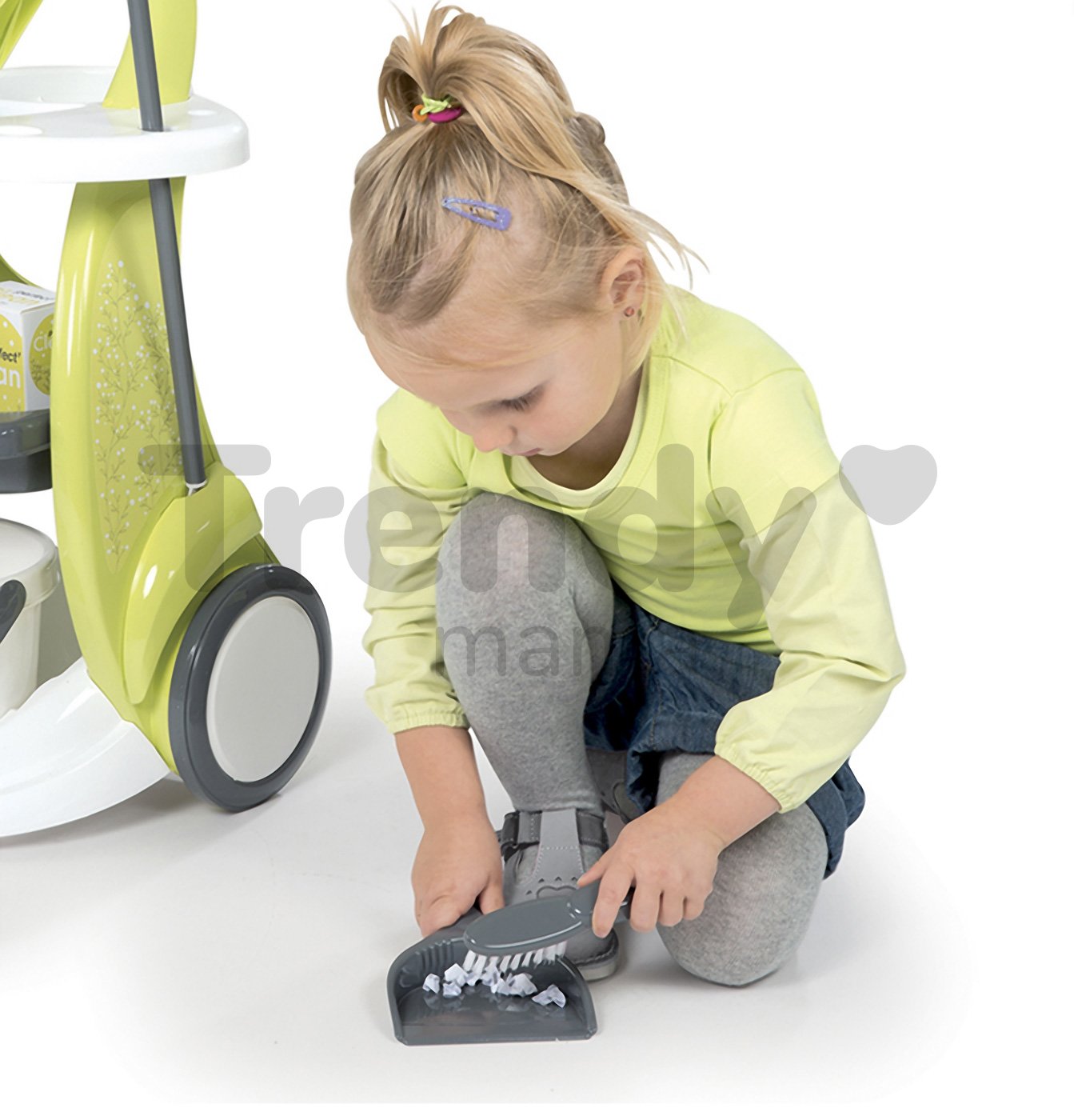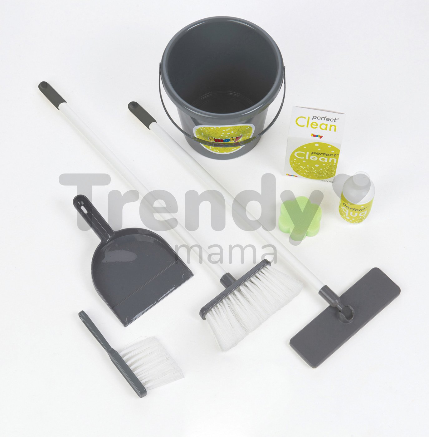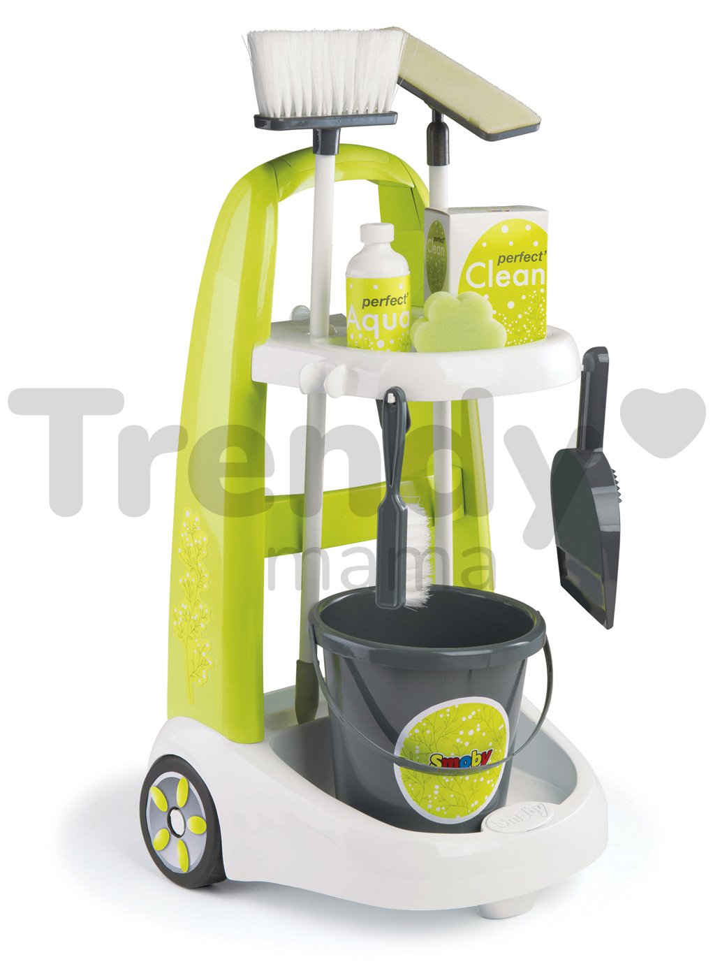 Upratovací vozík pre deti Clean je moderná a praktická hračka z dielne francúzskeho výrobcu Smoby, vhodná pre deti od 3 rokov. Detský vozík má štýlové prevedenie a je vyhotovený v sviežej kombinácii bielej, zelenej a sivej farby. Vozík na upratovanie má 2 kolieska, ktoré uľahčujú deťom jeho presúvanie, a tak ho malý pomocník či pomocníčka môže mať vždy poruke. Rukoväť vozíka je ergonomicky tvarovaná a veľkosťou prispôsobená detským rúčkam. Súčasťou detskej sady na upratovanie je vozík, vedro na vodu, moderný mop, metla, zmetáčik, lopatka na smeti, hubka na umývanie a správnym domácim pomocníkom pri upratovaní nesmú chýbať ani čistiace prostriedky. Každý doplnok má svoje miesto na praktickom vozíku pre deti.